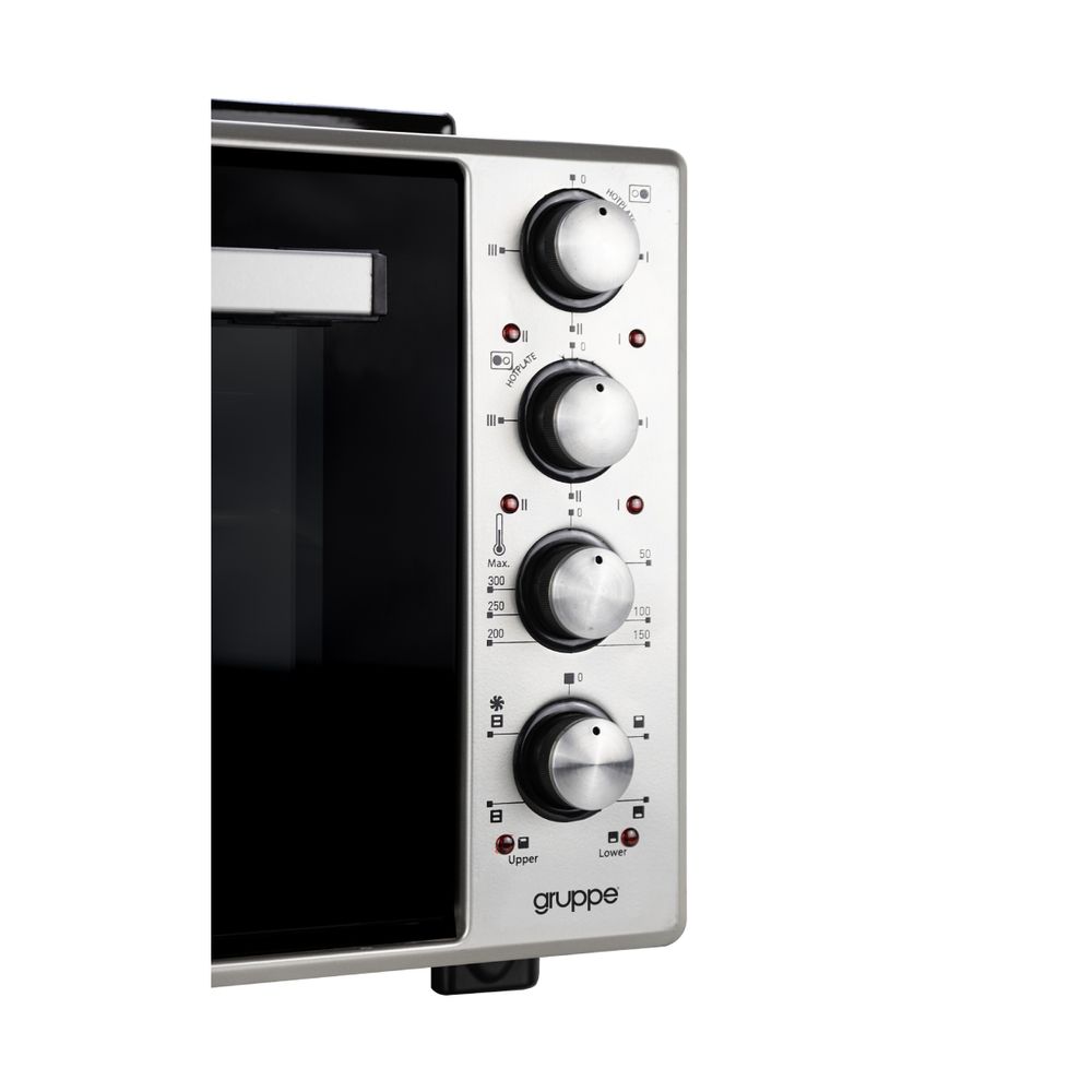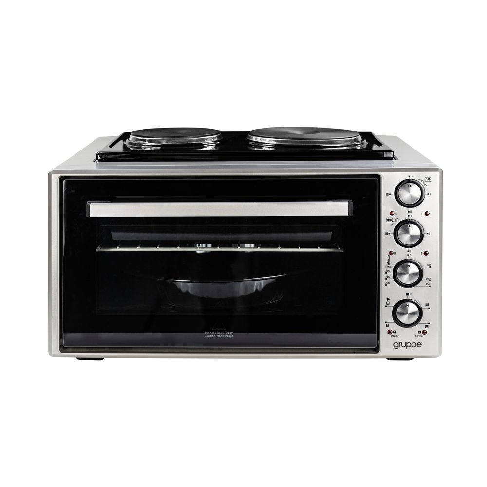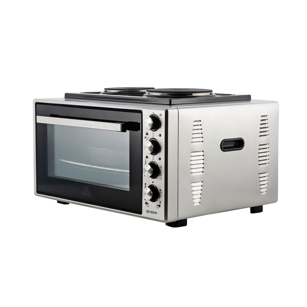 Το κουζινάκι Gruppe I-28HP Silver διαθέτει φούρνο χωρητικότητας 50 λίτρων και δύο εστίες στο επάνω μέρος. Έχει 4 λειτουργίες ψησίματος, δυνατότητα κυκλοφορίας θερμού αέρα για ομοιόμορφο ψήσιμο και ρυθμιζόμενο θερμοστάτη από 50°C έως 300°C. Οι εστίες είναι εμαγιέ, με ισχύ 1000W και 1500W. Περιλαμβάνει αξεσουάρ όπως στρόγγυλο και ορθογώνιο ταψί και σχάρα.