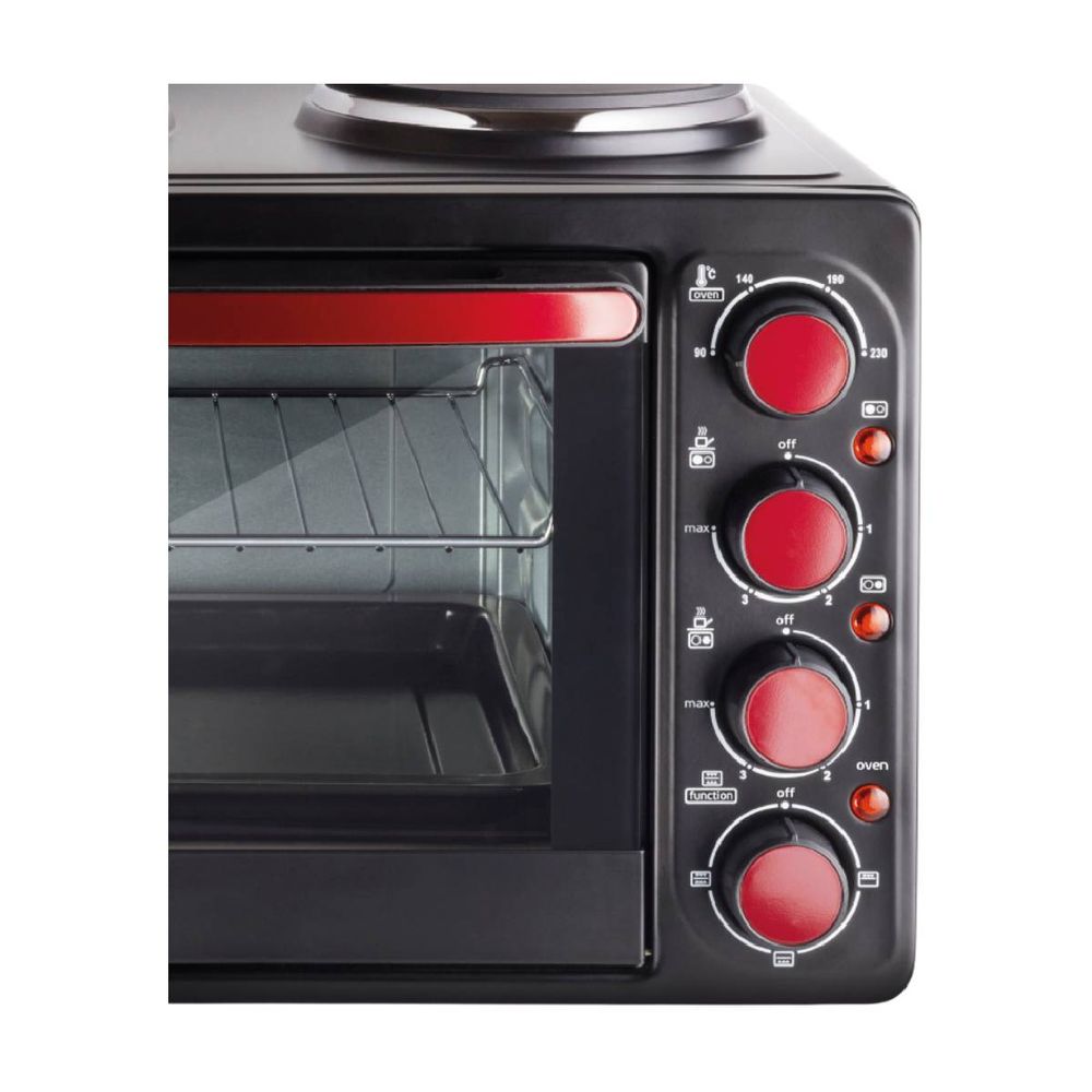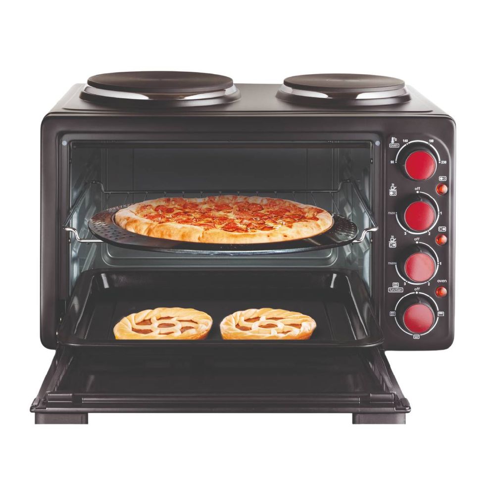 Χωρητικότητα φούρνου 28 Lt με 2 εστίες, ρυθμιζόμενος θερμοστάτης 90–230 °C, 3 επιλογές ψησίματος και πόρτα διπλού τζαμιού.