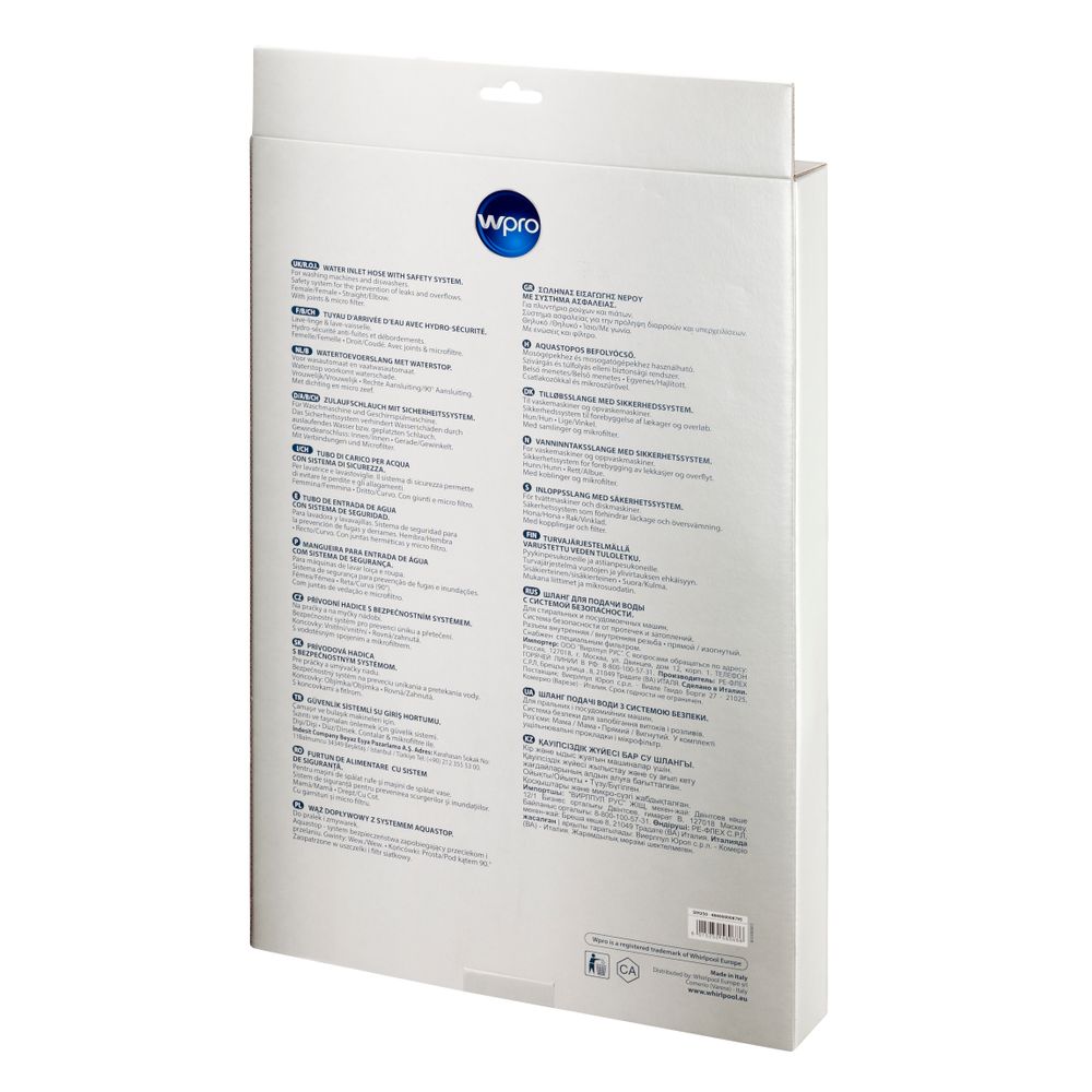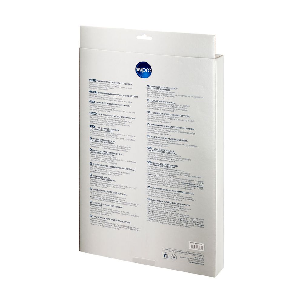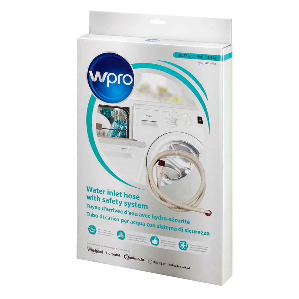 Μέγιστη ασφάλεια - οι εύκαμπτοι σωλήνες εισαγωγής φραγής νερού Wpro αποτρέπουν τη ζημιά στα πλυντήρια ρούχων ή τα πλυντήρια πιάτων που προκαλούνται από διαρροή νερού (π.χ. από σκασμένο σωλήνα). Κατάλληλο για θερμοκρασίες νερού έως 90°C.