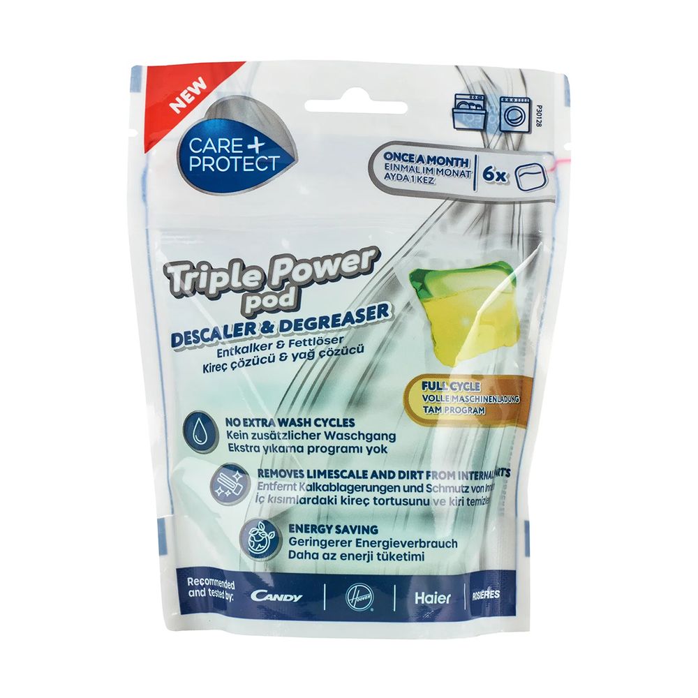 Τα Care+Protect Triple Power Pods συνδυάζουν αποτελεσματικά προϊόντα αφαλάτωσης, απολίπανσης και υγιεινής για πλυντήρια ρούχων και πλυντήρια πιάτων σε ένα μόνο προϊόν. Το πρώτο pod full load στην αγορά.
