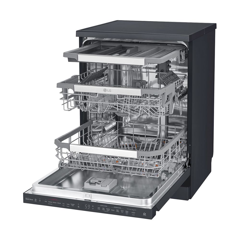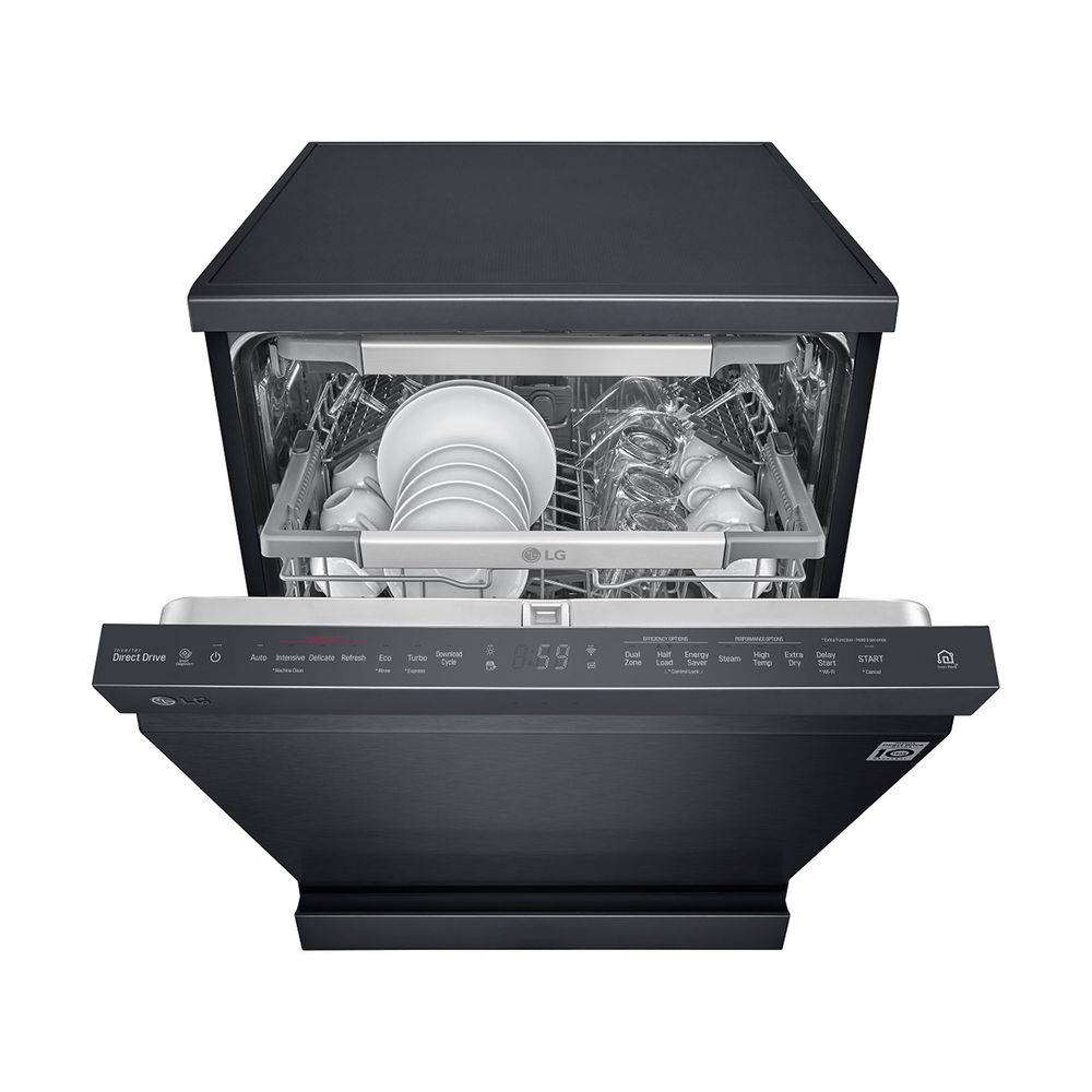 Πλυντήριο πιάτων με ατμό TrueSteam που δημιουργείται από ζεστό νερό και απλώνεται σε όλη την επιφάνεια του σκεύους κάνοντας τα πιάτα πιο αστραφτερά. Τα σωματίδια ατμού βοηθάνε στη μείωση των κηλίδων από το νερό. Χάρη στους βραχίονες ψεκασμού πολλαπλής κίνησης και τους ψεκαστήρες υψηλής πίεσης, το QuadWash εξασφαλίζει μέγιστο καθαρισμό με ένα μόνο πέρασμα. Κατεβάζοντας την εφαρμογή SmartThinQ, βρίσκεις προγράμματα πλυσίματος για κάθε σου ανάγκη, όπως για κατσαρόλες, τηγάνια και ευαίσθητα σκεύη.