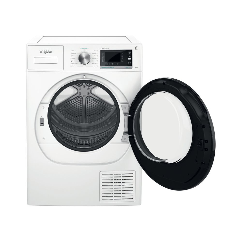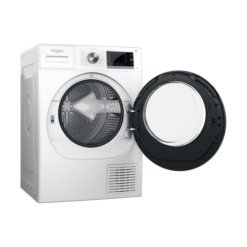 Στεγνωτήριο Whirlpool W7 D94WB EE, 9kg, με τεχνολογία 6ης αίσθησης που παρακολουθεί συνεχώς την υγρασία εντός του κάδου, αντλία θερμότητας που επαναθερμαίνει αποτελεσματικά τον αέρα και τεχνολογία φροντίδας 3Dry Air Care με ροή αέρα 3D AirFlow και SoftMove, για απαλό δράση στεγνώματος.