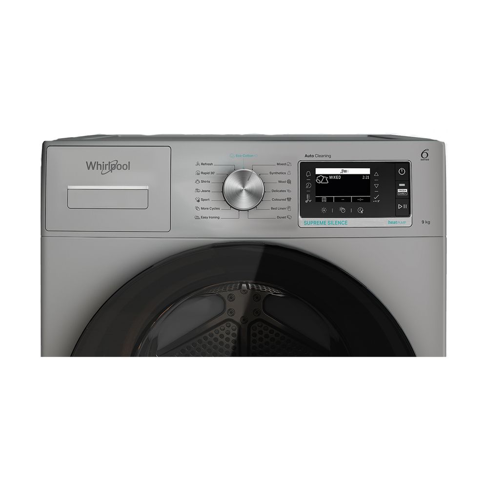 Στεγνωτήριο Whirlpool W7 D93SB EE, 9kg, με τεχνολογία 6ης αίσθησης που παρακολουθεί συνεχώς την υγρασία εντός του κάδου, αντλία θερμότητας που επαναθερμαίνει αποτελεσματικά τον αέρα και τεχνολογία φροντίδας 3Dry Air Care με ροή αέρα 3D AirFlow και SoftMove, για απαλό δράση στεγνώματος.