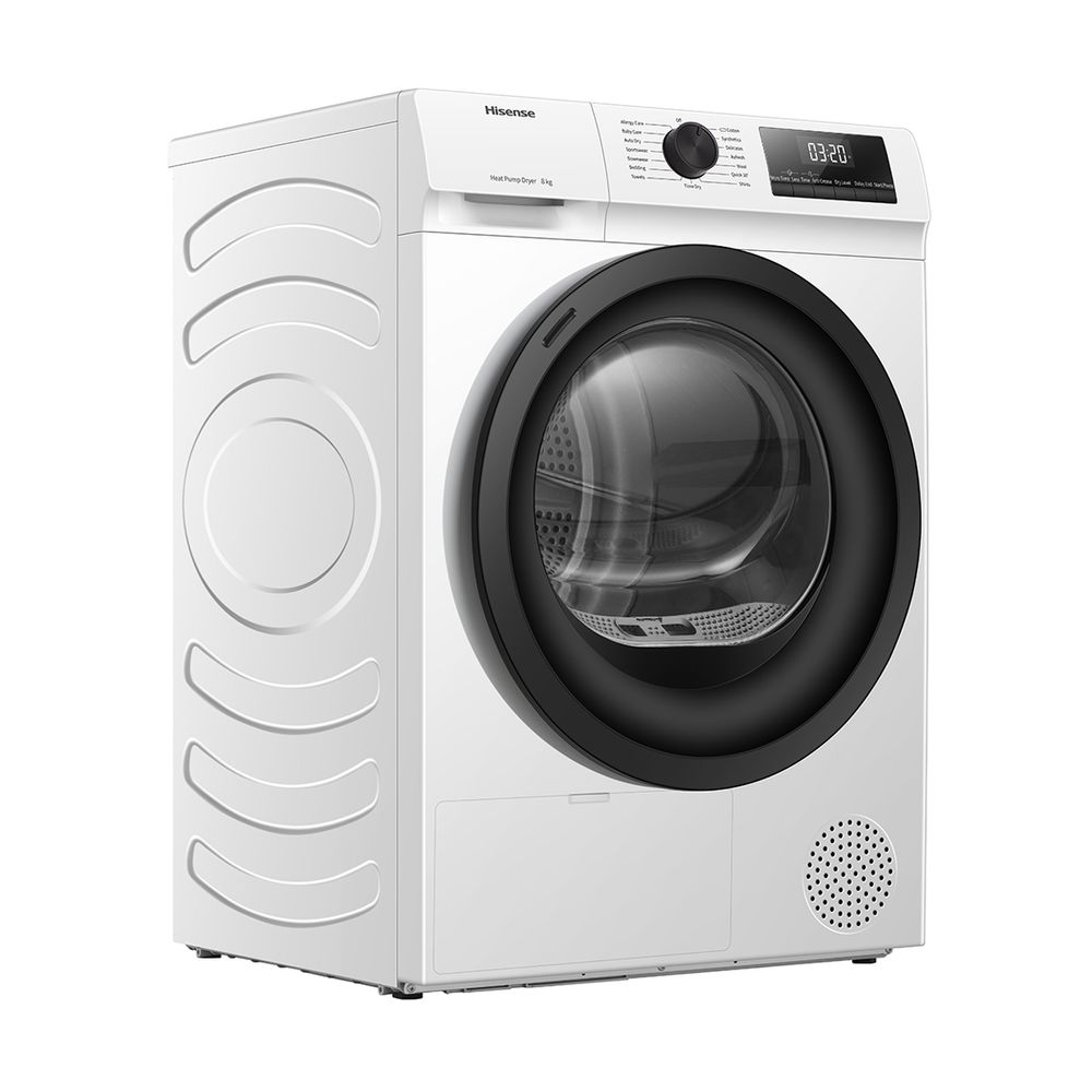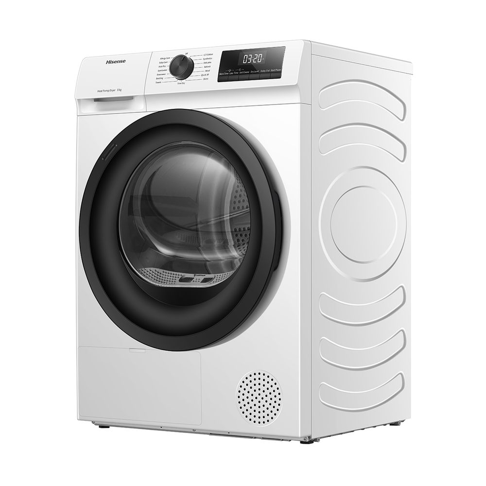 Στεγνωτήριο ρούχων Hisense DHQE800BW2 χωρητικότητας 8kg, με 16 προγράμματα στεγνώματος, τεχνολογία Auto Dry προσαρμόζει αυτόματα χρόνο και θερμοκρασία ανάλογα με τον βαθμό υγρασίας, ειδικό κύκλο για απομάκρυνση αλλεργιογόνων και ειδικό πρόγραμμα για βρεφικά ρούχα.