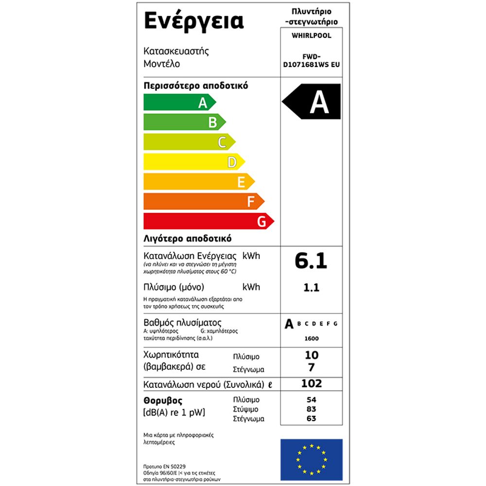 Whirlpool FWDD1071681WS EU 10/7kg Πλυντήριο - Στεγνωτήριο