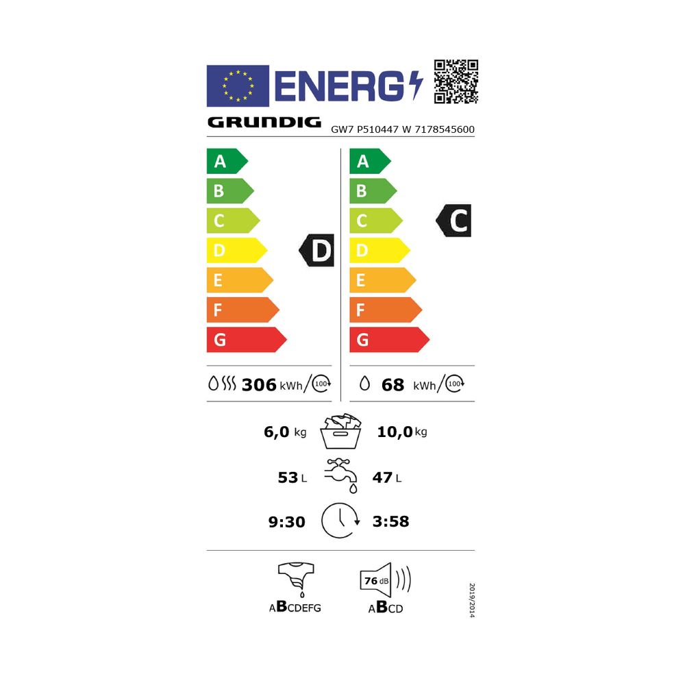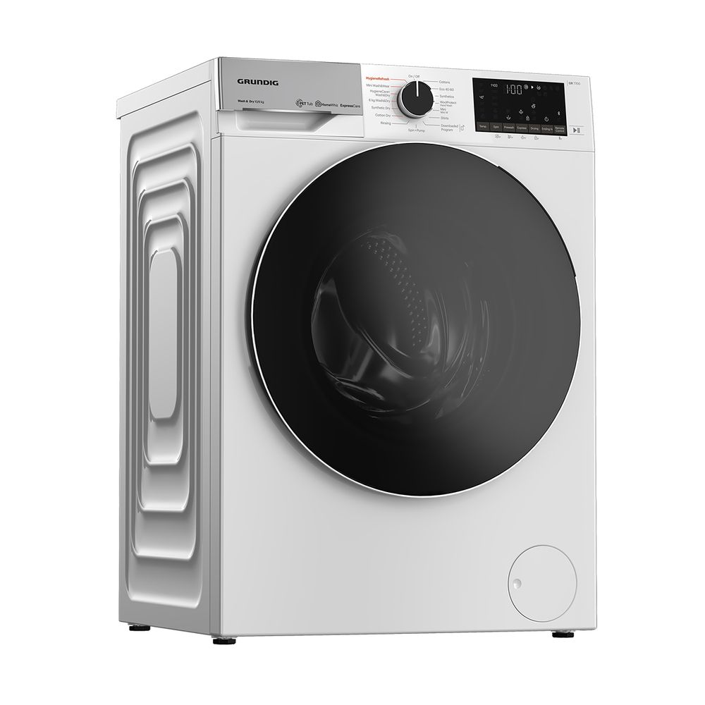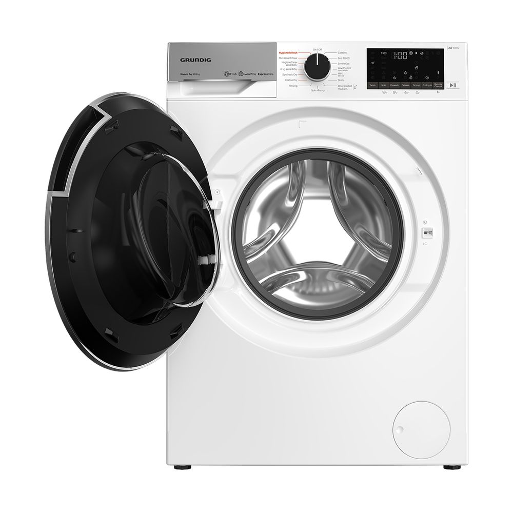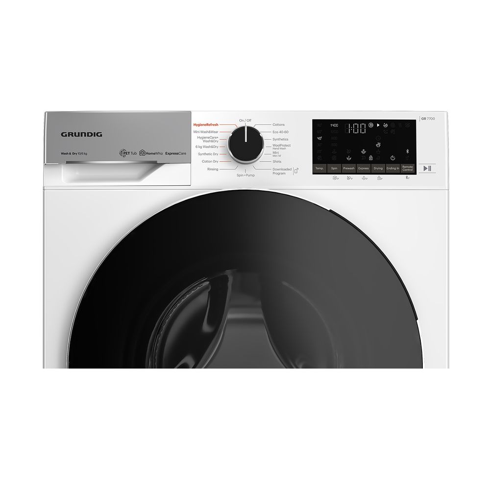 Πλυντήριο-στεγνωτήριο Grundig GW7P510447W με χωρητικότητα 10 kg στην πλύση και 6 kg στο στέγνωμα και πρόγραμμα Wash & Dry για απευθείας πλύση και στέγνωμα φορτίου 6 κιλών μέσα σε 60 λεπτά.