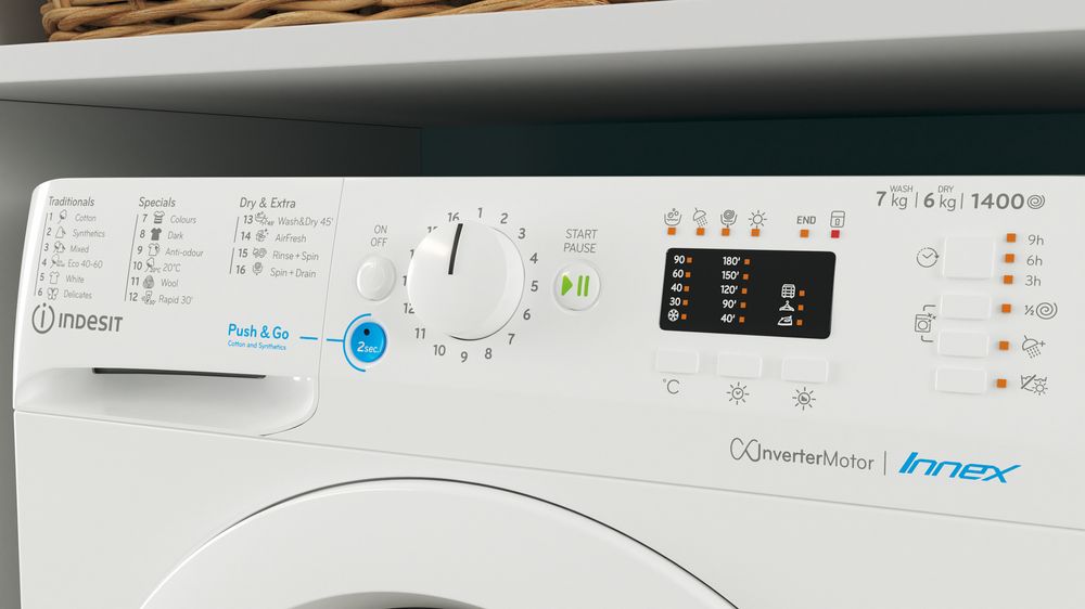 Αυτό το ελεύθερο πλυντήριο-στεγνωτήριο Indesit διαθέτει μεγάλη χωρητικότητα στεγνώματος 6,0 κιλών, υψηλή, οικονομική ταχύτητα στυψίματος 1400 περιστροφών ανά λεπτό. Διαθέτει χαρακτηριστικά Push&Go για πλύσιμο και στέγνωμα στη στιγμή, Wash&Dry 45 για γρήγορο πλύσιμο, επιλογή κατά των οσμών για ρούχα γεμάτα φρεσκάδα και καθαρισμό Express.
