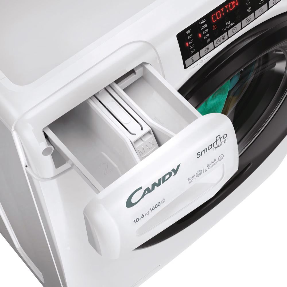 Πλυντήριο - στεγνωτήριο Candy με χωρητικότητα 10 kg και 6 kg αντίστοιχα, κινητήρα Speed-Drive Inverter, σύστημα Quick&Clean, πρόγραμμα Easy Iron Plus 39' και δυνατότητα απομακρυσμένου χειρισμού μέσω WiFi.