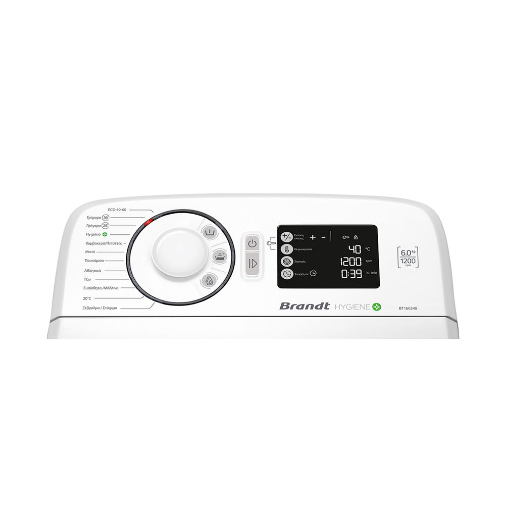 Πλυντήριο ρούχων άνω φόρτωσης Brandt BT16024G χωρητικότητας 6 κιλών, 1200 στροφών και με πρόγραμμα Hygiene, για γρήγορο και υγιεινό καθαρισμό.