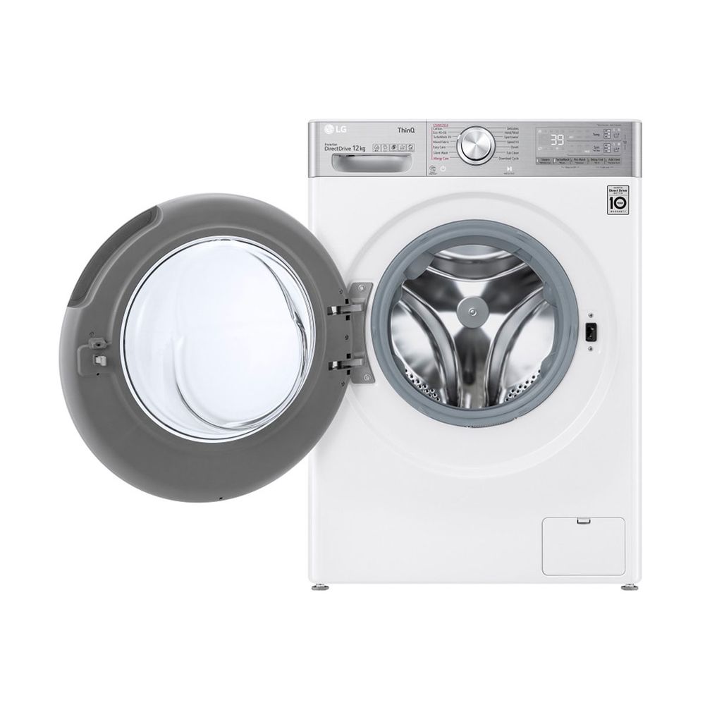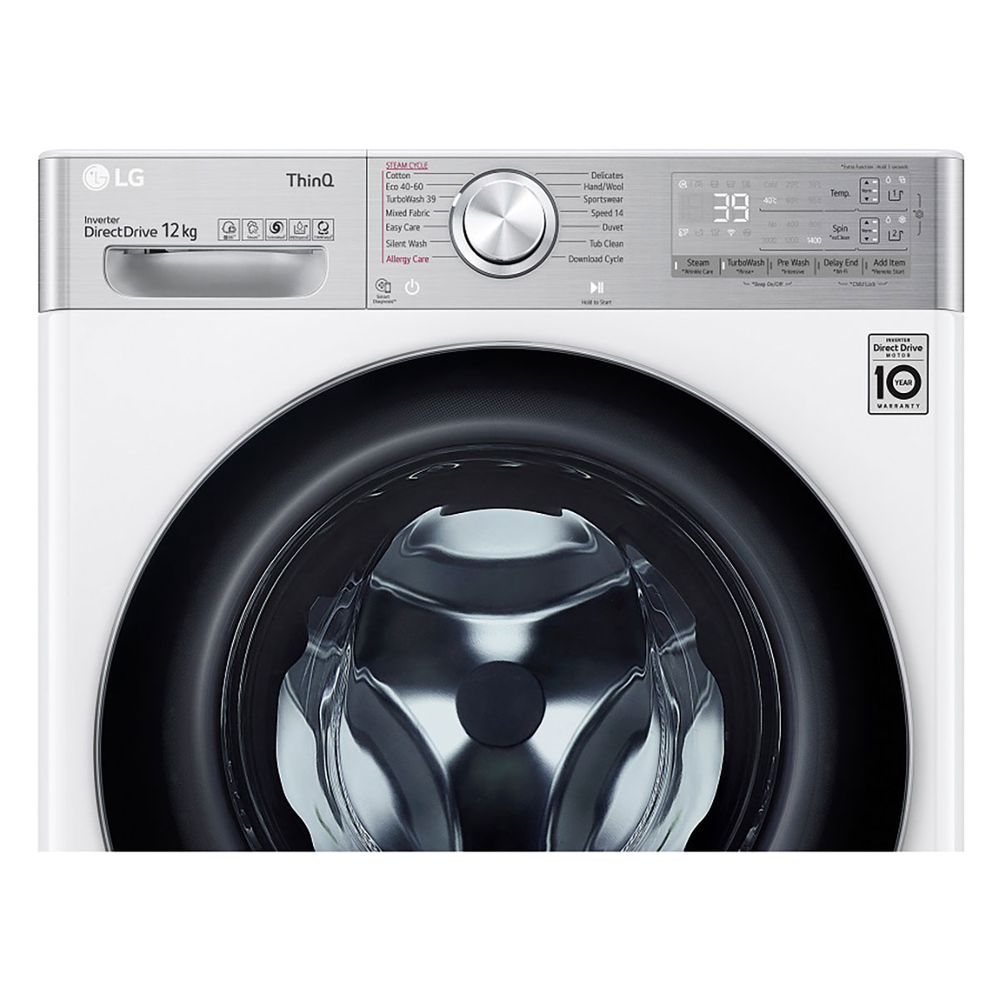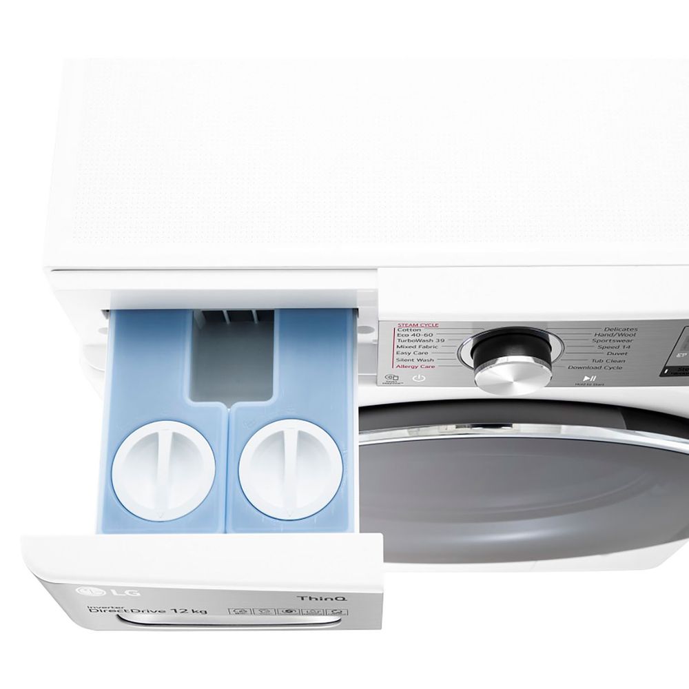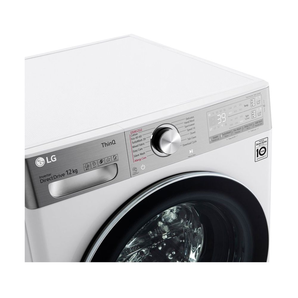 Πλυντήριο ρούχων LG χωρητικότητας 12 kg με προηγμένο σύστημα AI DD, λειτουργία TurboWash 360˚ για πλύσιμο σε 39 λεπτά και τεχνολογία Steam+ που εγγυάται εξάλειψη των αλλεργιογόνων και λιγότερες ζάρες για εύκολο σιδέρωμα.