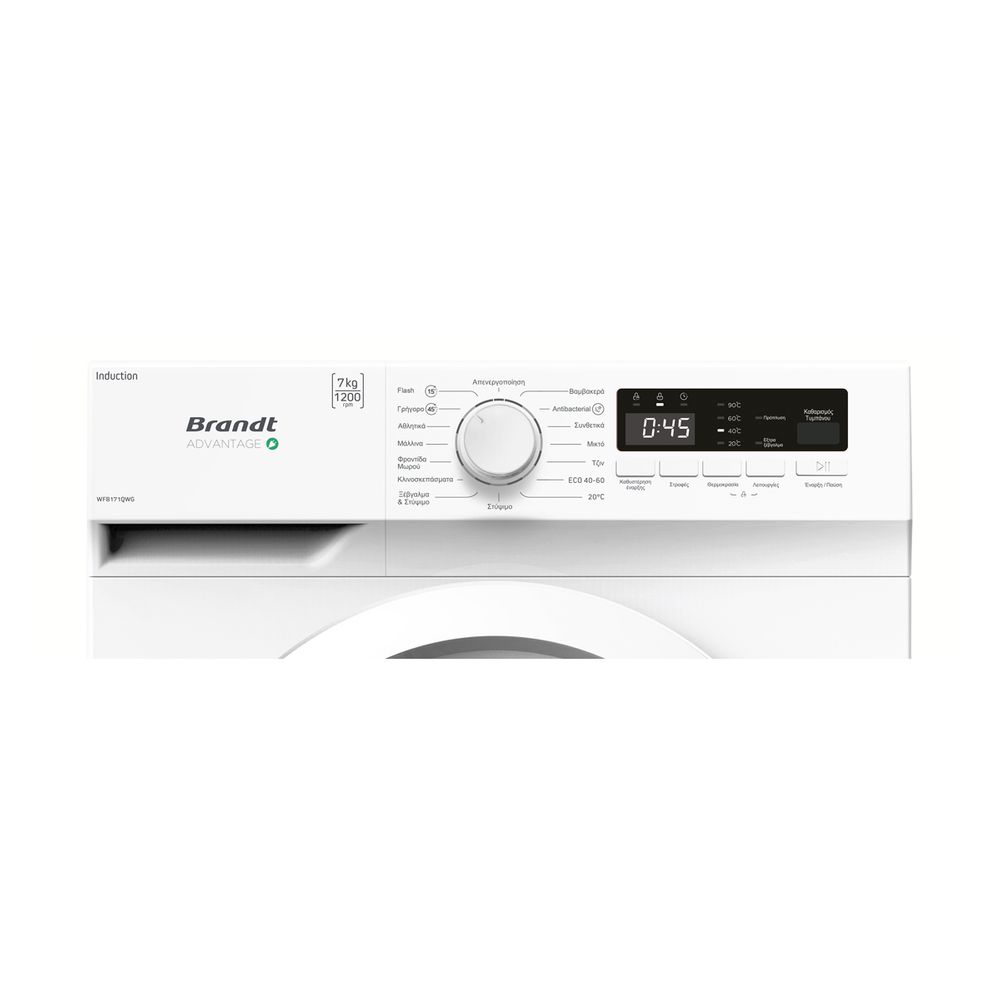 Πλυντήριο ρούχων Brandt WFB171QWG με χωρητικότητα 7kg και 1200 στροφές, πρόγραμμα Antibacterial με ατμό και φροντίδας μωρού, δυνατότητα καθυστέρησης έναρξης πλύσης και λειτουργία καθαρισμού τυμπάνου.
