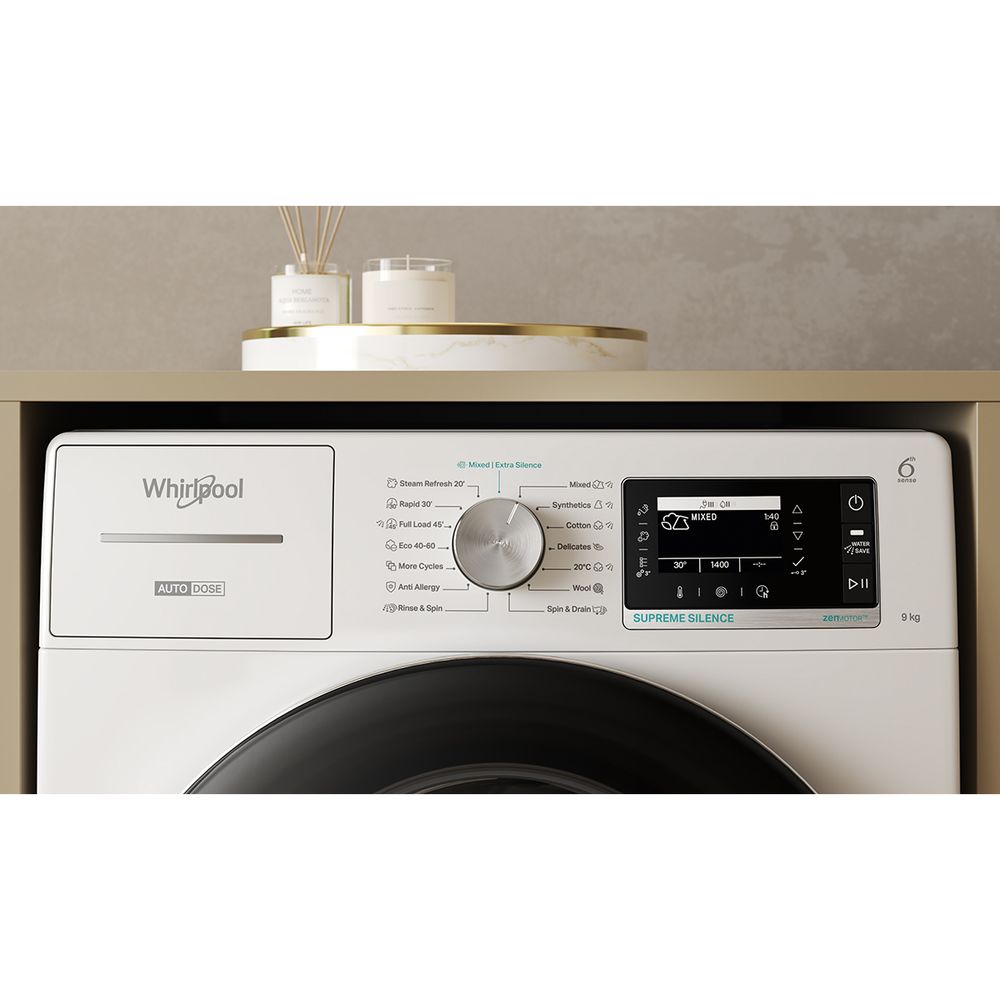 Το πλυντήριο ρούχων Whirlpool W8 99AD SILENCE EE προσφέρει κορυφαία πλύση με χωρητικότητα 9kg και ταχύτητα 1400 στροφών. Διαθέτει 24 προγράμματα, όπως AutoDose για αυτόματη δοσολογία απορρυπαντικού, Steam Refresh για φρεσκάρισμα σε 20’ και WaterSave για εξοικονόμηση νερού. Η τεχνολογία 6ης Αίσθησης προσαρμόζει αυτόματα τις ρυθμίσεις, ενώ οι λειτουργίες FreshCare+ και Supreme Silence εξασφαλίζουν φροντίδα και ησυχία. Ιδανικό για απαιτητικές ανάγκες με ασφάλεια για παιδιά.