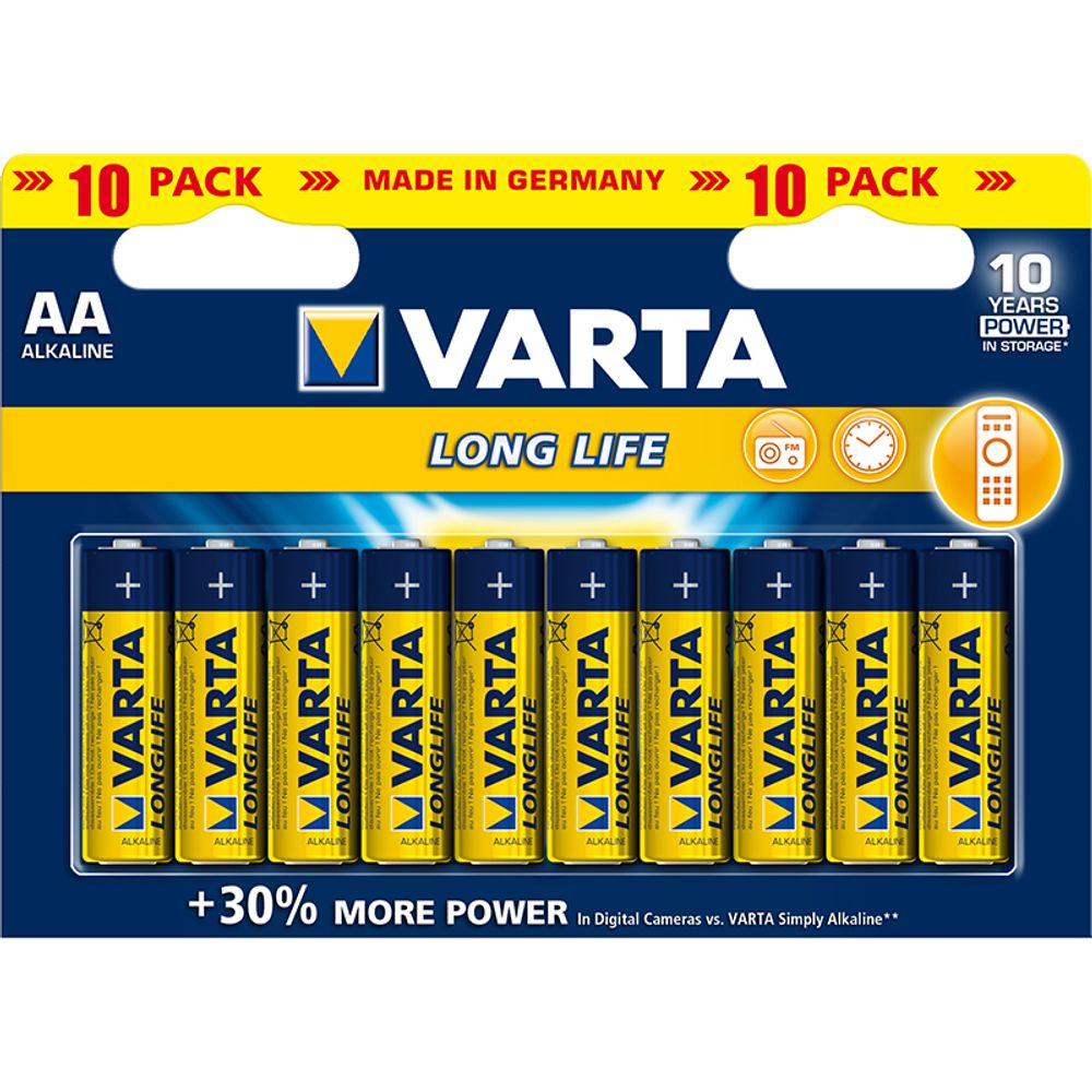 Συσκευασία με 10 αλκαλικές μπαταρίες AA Longlife, με 30% περισσότερη ισχύ στις ψηφιακές κάμερες, σε σχέση με τις απλές αλκαλικές μπαταρίες της Varta.