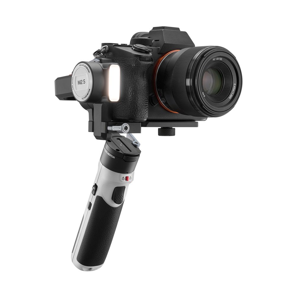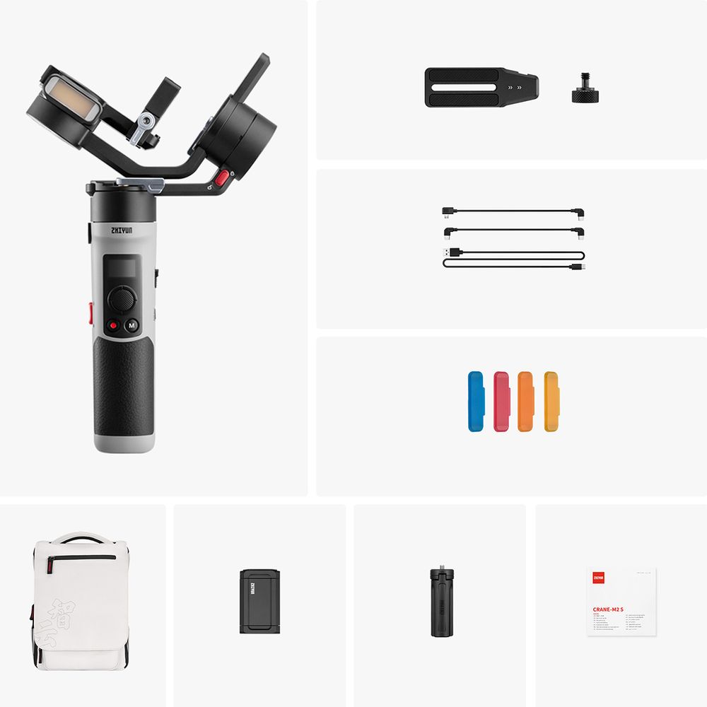 Zhiyun Crane M2S Combo. Gimbal σταθεροποίησης τριών αξόνων για φωτογραφικές μηχανές mirrorless και smartphones, με ενσωματωμένο φωτιστικό LED και οθόνη ενδείξεων, μαζί με σφιγκτήρα συγκράτησης smartphone και τσάντα μεταφοράς. Το Crane M2S αποτελεί βελτίωση του προκατόχου μοντέλου Crane M2 και σε βοηθά να διευρύνεις τις δυνατότητές σου στη βιντεοσκόπηση με την ολοκαίνουργια συμπαγή σχεδίασή του, τη βελτιωμένη συμβατότητα και το ενσωματωμένο LED συμπληρωματικού φωτισμού.