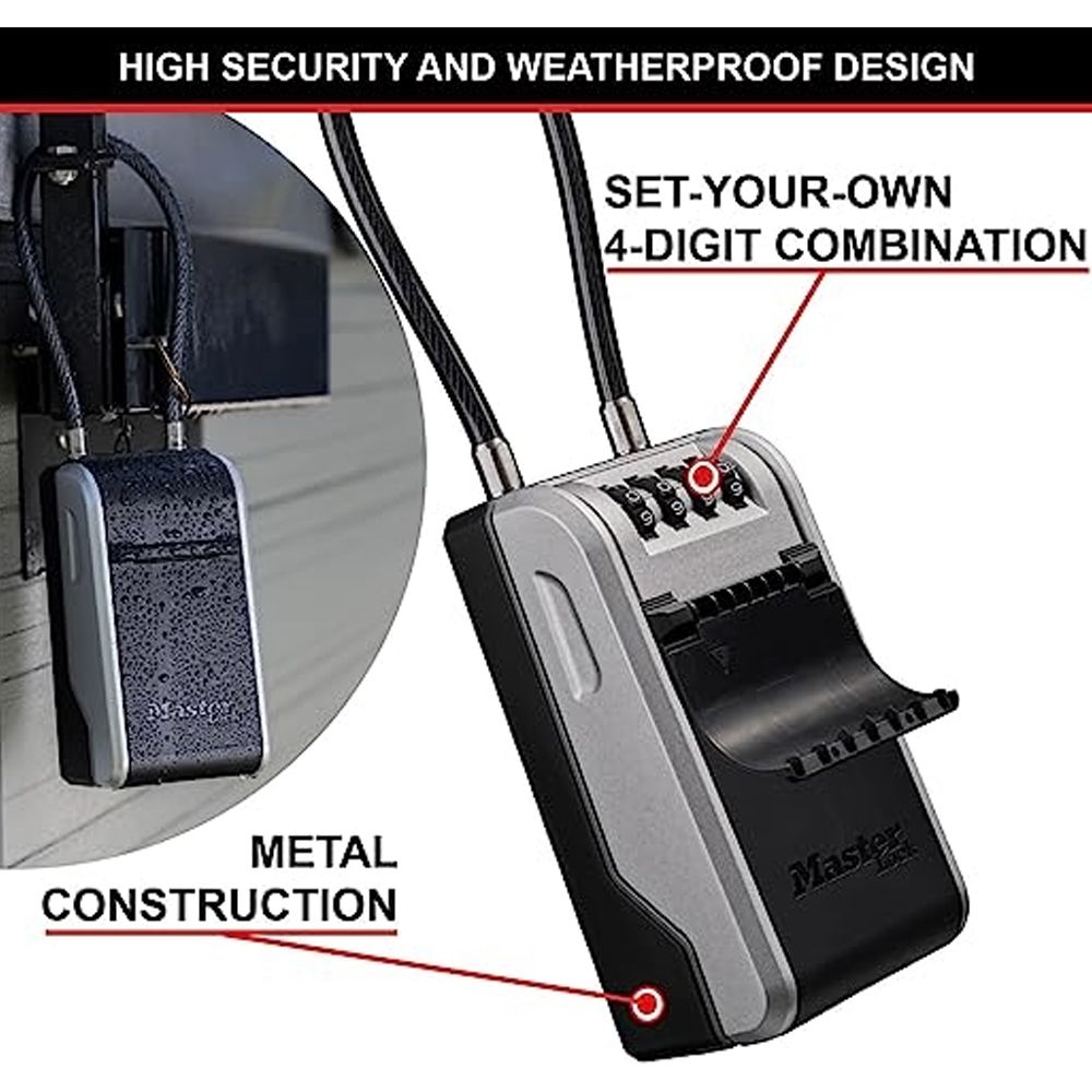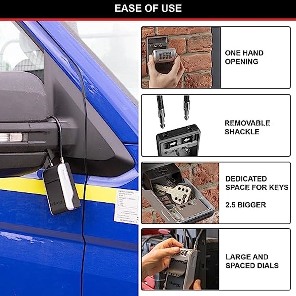 Εξαιρετική λύση για ιδιοκτήτες Airbnb και ενοικίαση σπιτιού. Παρέχει εύκολη πρόσβαση σε φροντιστές και κατ’ οίκον εργαζόμενους. Ιδανικό για να μοιράζεσαι τα κλειδιά με την οικογένεια ή τους συγκατοίκους σου. Ρύθμισε τον δικό σου 4ψήφιο συνδυασμό (περισσότεροι από 10.000 πιθανοί συνδυασμοί). Διαθέτει πλαστικό κάλυμμα προστασίας από τις καιρικές συνθήκες.