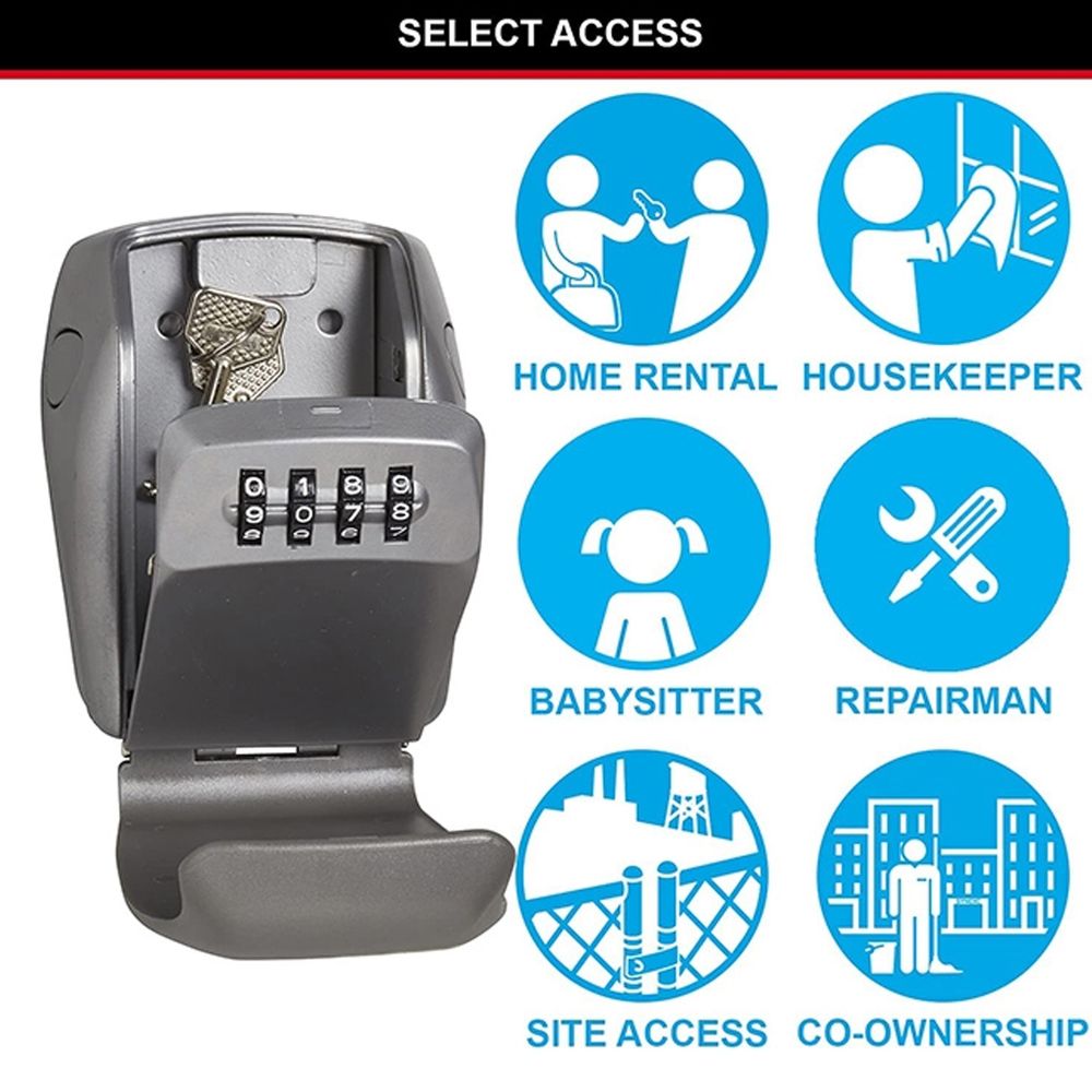 Η συσκευή ελεγχόμενης πρόσβασης Master Lock Select Access αυξημένης ασφάλειας με προστατευτικό κάλυμμα διαθέτει μεταλλικό σώμα πλάτους 105 mm για ανθεκτικότητα. Το Select Access είναι η τέλεια λύση για κοινή χρήση κλειδιών. Ο σχεδιασμός επιτοίχιας στήριξης προσφέρει μόνιμη εγκατάσταση. Όρισε τον δικό σου συνδυασμό για ευκολία χωρίς κλειδί και αυξημένη ασφάλεια. Το προστατευτικό κάλυμμα για τις καιρικές συνθήκες αποτρέπει το πάγωμα, το μπλοκάρισμα και επιθέσεις διάρρηξης.