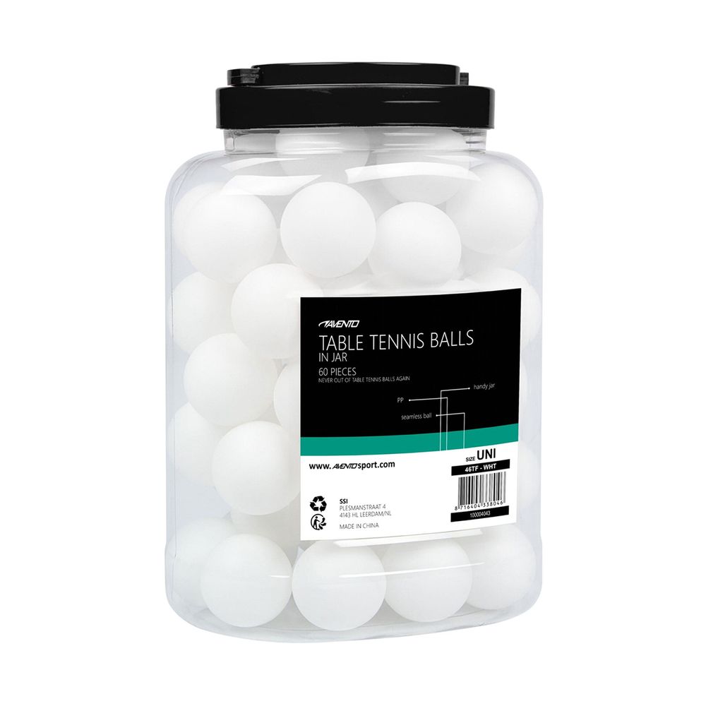 Μπαλάκια ping pong Avento, 60 τεμάχια με διάμετρο 40 mm, χωρίς ραφή και εκτύπωση, σε βολική συσκευασία εύχρηστου δοχείου με βιδωτό καπάκι και λαβή. Κατασκευασμένα από υλικό PP για καλύτερη αναπήδηση. \n