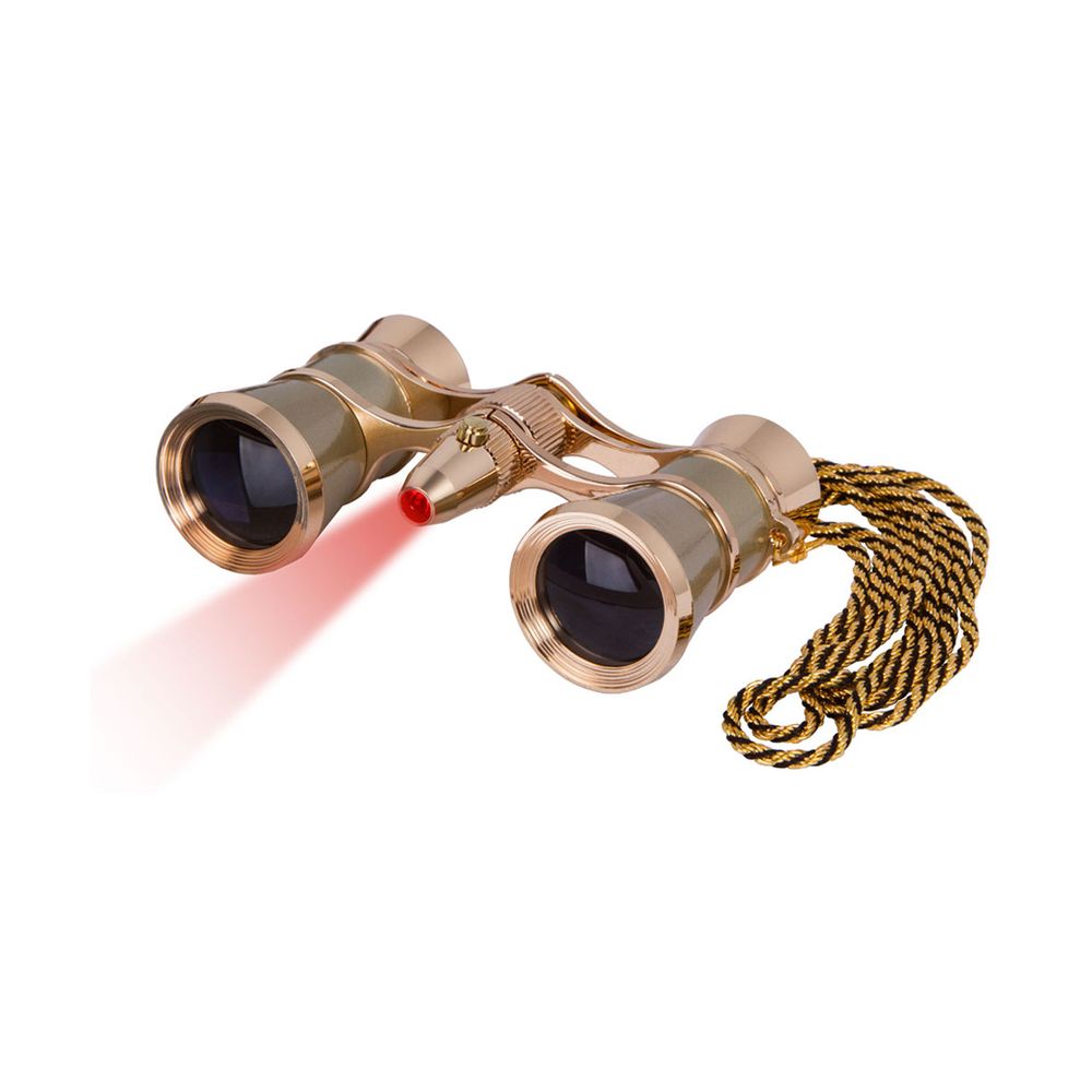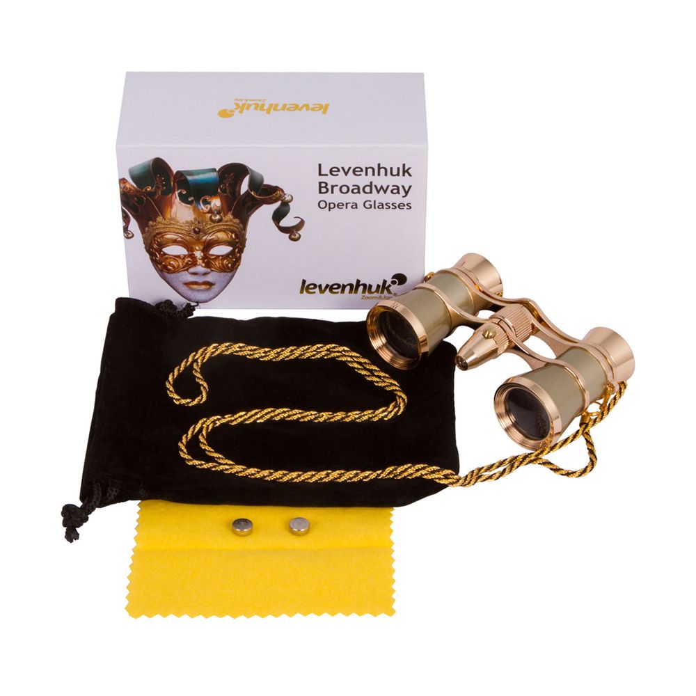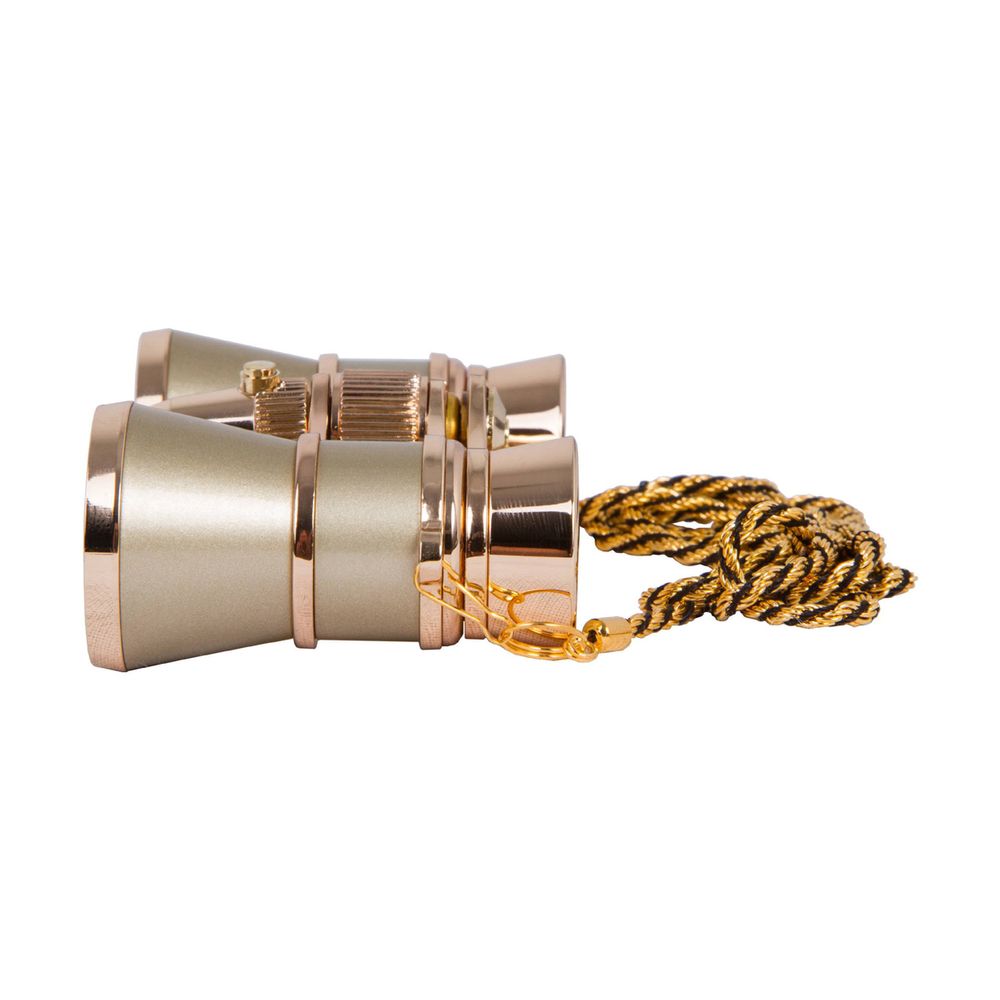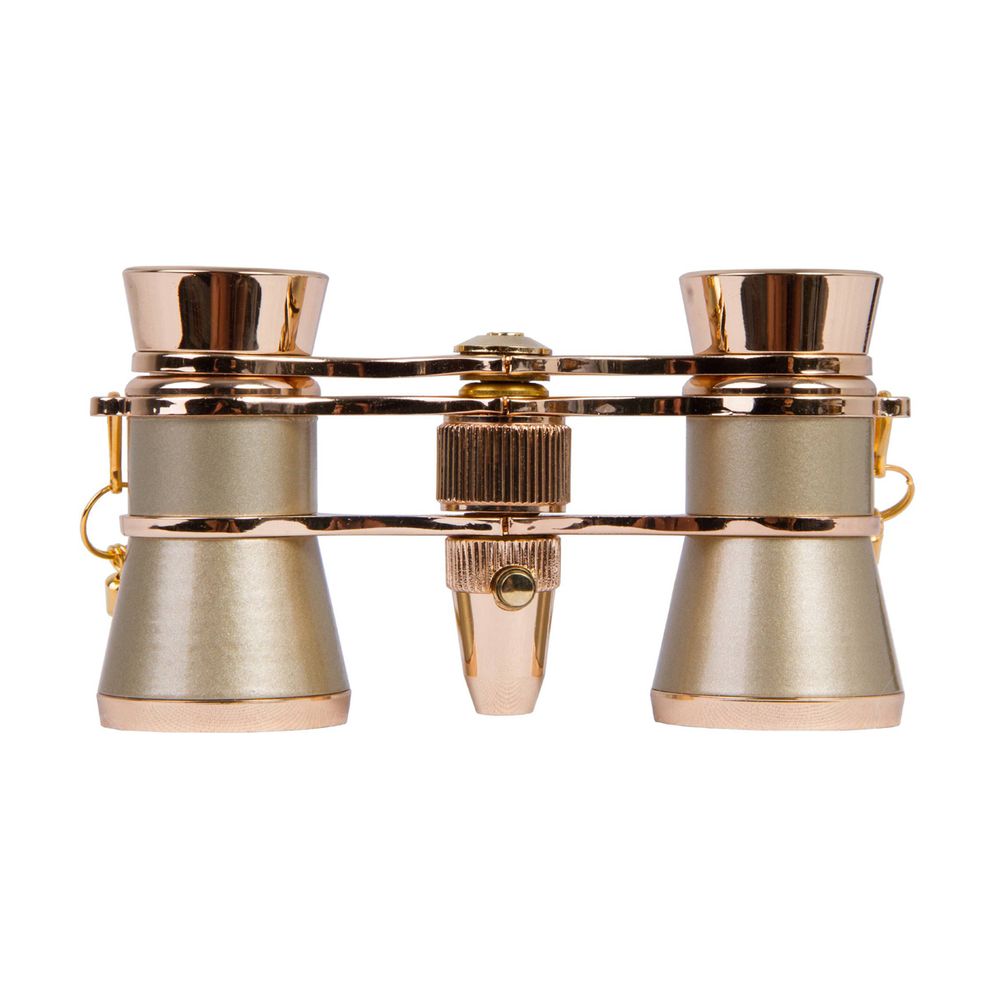 Κιάλια όπερας Levenhuk Broadway 325F σε χρυσό χρώμα, με κεντρική εστίαση, εξοπλισμένα με φως LED και αφαιρούμενη αλυσίδα. Αν και είναι κατασκευασμένα από μέταλλο, είναι ελαφριά και τόσο συμπαγή που μπορείς να τα μεταφέρεις στο μικρότερο τσαντάκι.