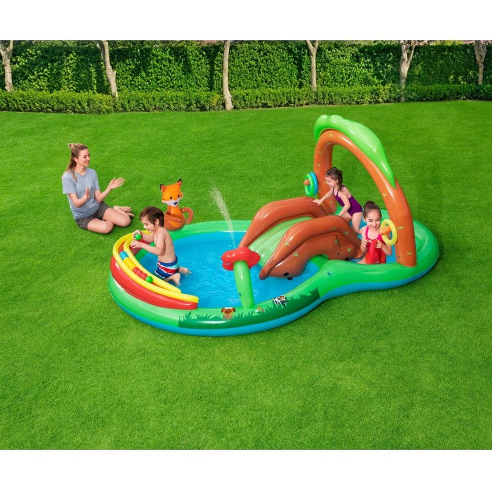 Περιλαμβάνει παιχνίδι με 4 φουσκωτούς δακτυλίους, παιχνίδι με 10 μπάλες, φουσκωτή αλεπού και λουλούδι - εκτοξευτή σπρέι νερού που συνδέεται με λάστιχο. Διαθέτει αποσπώμενη φουσκωτή τσουλήθρα.