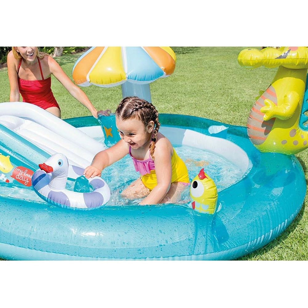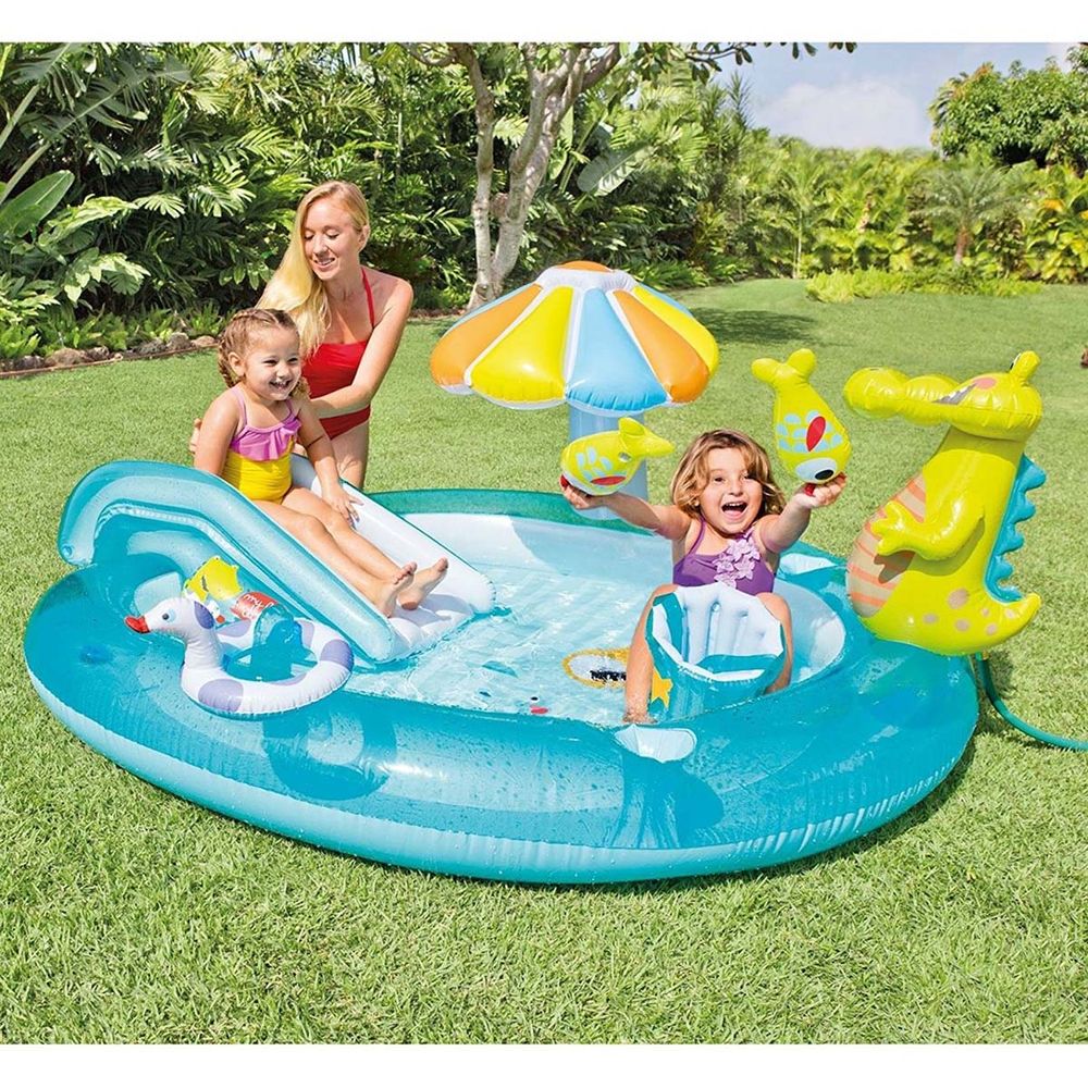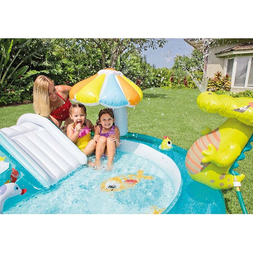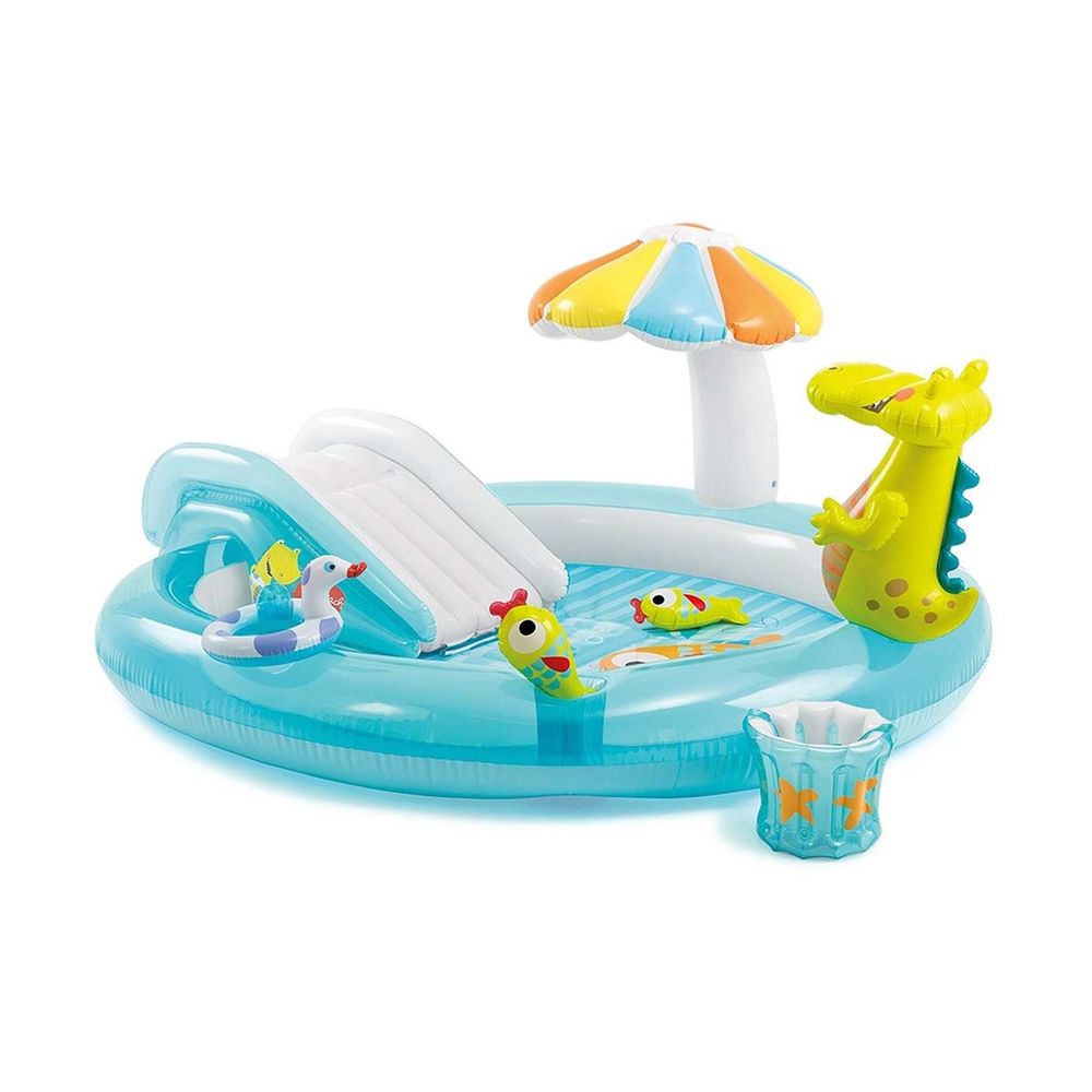 Πισίνα - παιδότοπος Gator Play Center. Περιέχει νεροτσουλήθρα, αλιγάτορα, σκίαστρο-μανιτάρι, μωρό πάπια, κουβά ψαρέματος και φουσκωτό χαλάκι προσγείωσης. Σύνδεσε το λάστιχο του κήπου για να δροσίσεις τα παιδιά με το ψεκαστήρι. Περιλαμβάνονται υλικά επιδιόρθωσης.