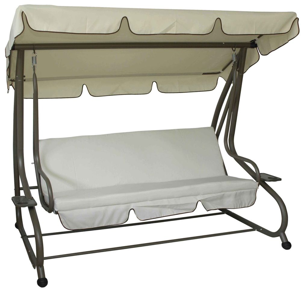 Kούνια - Κρεβάτι εκρού με ανθράκι μεταλικό σκελετό, τριθέσια με μαξιλάρες αδιάβροχες και μονοκόμματο σωλήνα οροφής με σκίαστρο.
