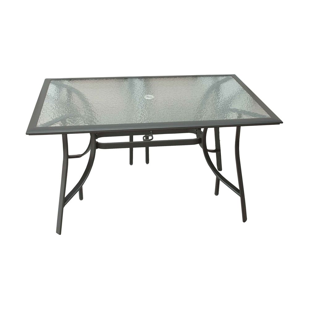 Τραπέζι αλουμινίου κήπου με γυαλί και ανθρακί σκελετό, της εταιρείας Velco, κατάλληλο για εξωτερικούς χώρους όπως βεράντα ή κήπος.