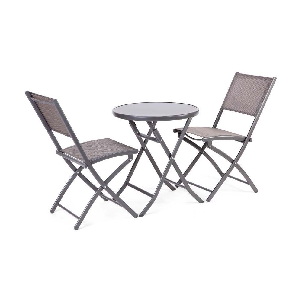 Σετ μεταλλικού τραπεζιού με γυάλινη επιφάνεια και καρέκλες από αντι-σκουριακό υλικό, ιδανικό για εξωτερικό χώρο που αναδιπλώνει ώστε να καταλαμβάνει λιγότερο χώρο όταν δεν το χρειάζεσαι.