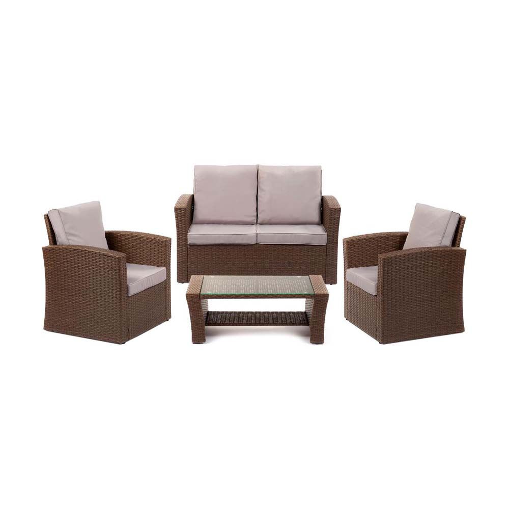Το σετ περιλαμβάνει δύο πολυθρόνες, έναν καναπέ και ένα τραπέζι. Περιλαμβάνονται επίσης αδιάβροχα μαξιλάρια. Το σετ είναι κατάλληλο για εσωτερικούς και εξωτερικούς χώρους (κήπους, βεράντες, μπαλκόνι).