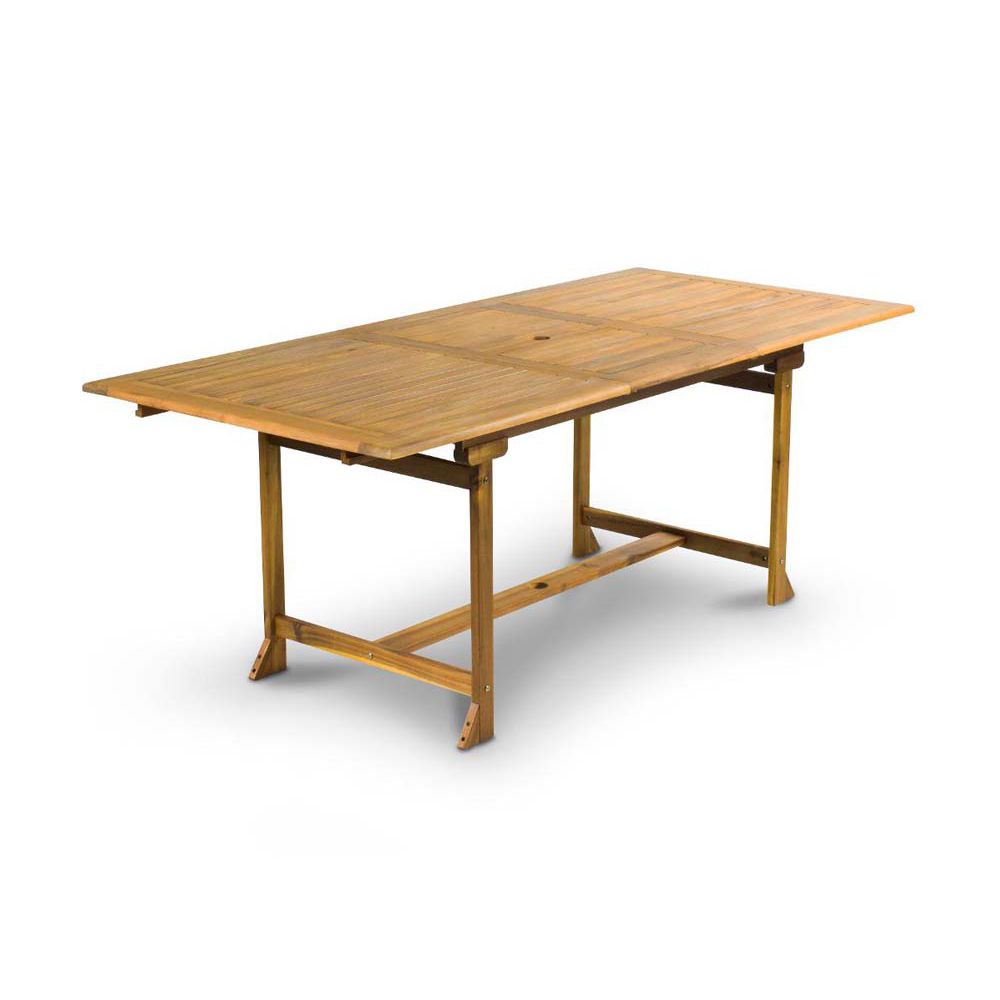 Ένα μεγάλο ξύλινο ορθογώνιο επεκτεινόμενο και αναδιπλούμενο τραπέζι υψηλής ποιότητας με τρύπα στο κέντρο της επιφάνειας του όπως επίσης και στο κάτω μέρος της βάσης του για την καλύτερη πιθανή στήριξη ομπρέλας. Το τραπέζι είναι κατασκευασμένο από ξύλο ακακίας, ένα υλικό που είναι πολύ σκληρό και μπορεί να αντισταθεί στις δυσμενείς επιπτώσεις του καιρού, την μούχλα, τους μύκητες και κάθε είδους έντομα που καταστρέφουν το ξύλο. Μια εξαιρετική επιλογή για τον κήπο ή την αυλή σου.