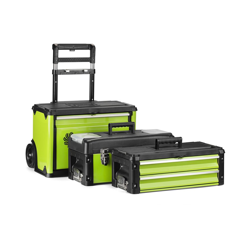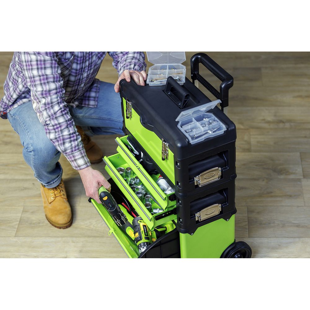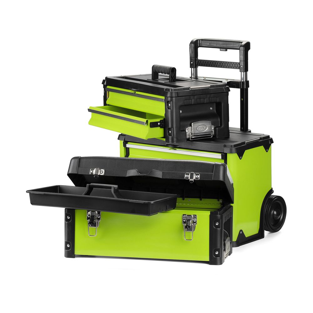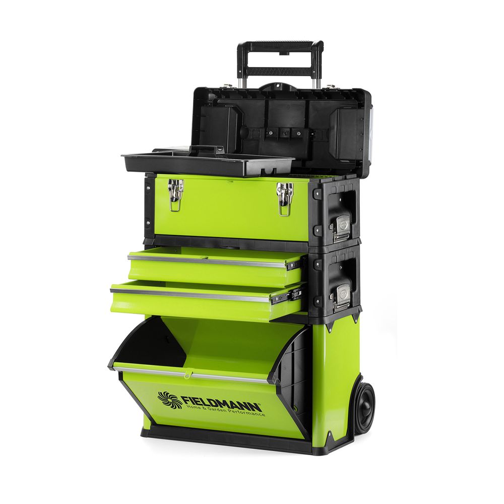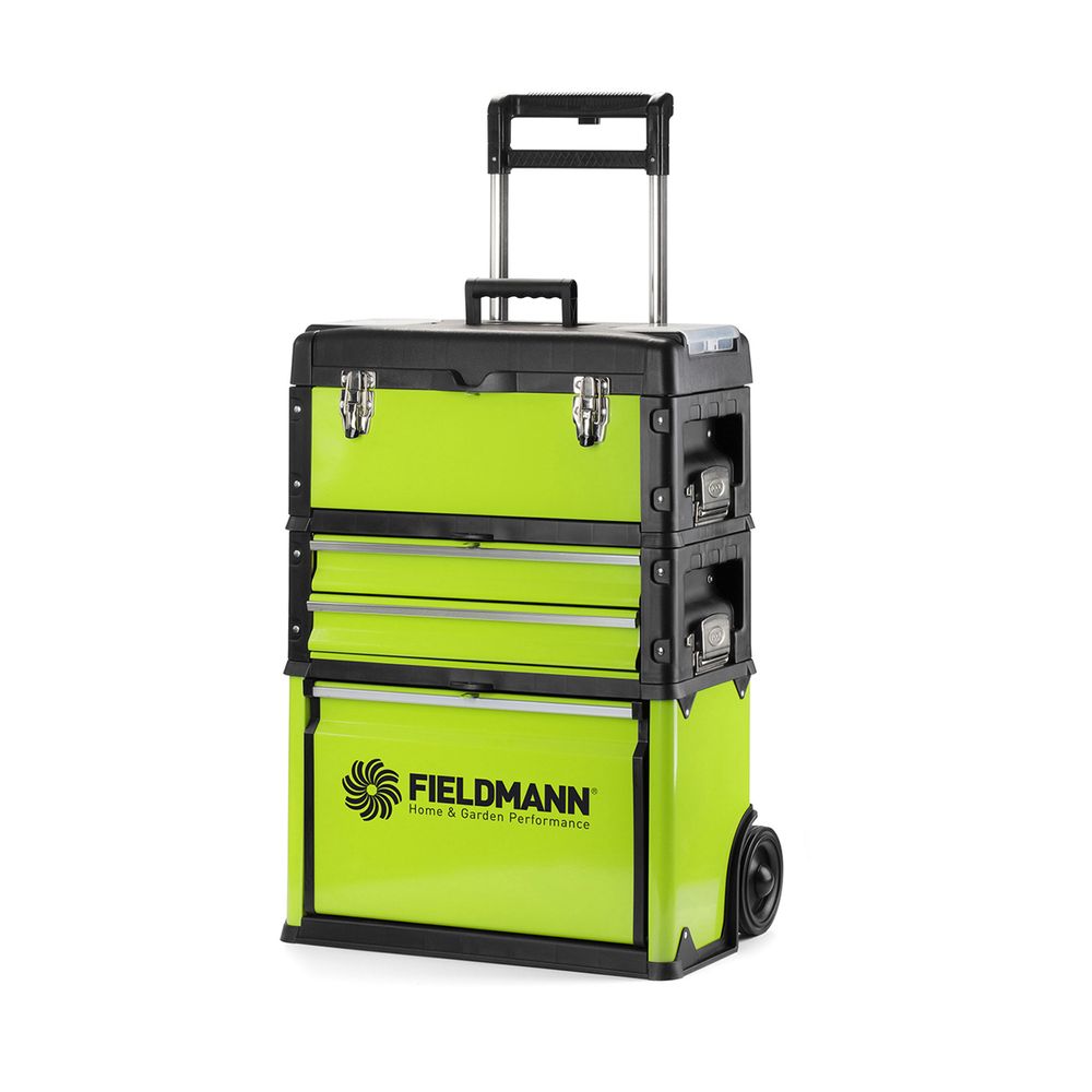 Τριμερής εργαλειοθήκη Fieldmann, κατασκευασμένη από μέταλλο, τροχούς από σκληρυμένο πλαστικό και τηλεσκοπική λαβή για εύκολη μεταφορά. Με διαστάσεις 520 × 320 × 721 mm, δυνατότητα χωρισμού σε τρία κουτιά, το καθένα με πτυσσόμενες λαβές και πόρπες ασφαλείας.