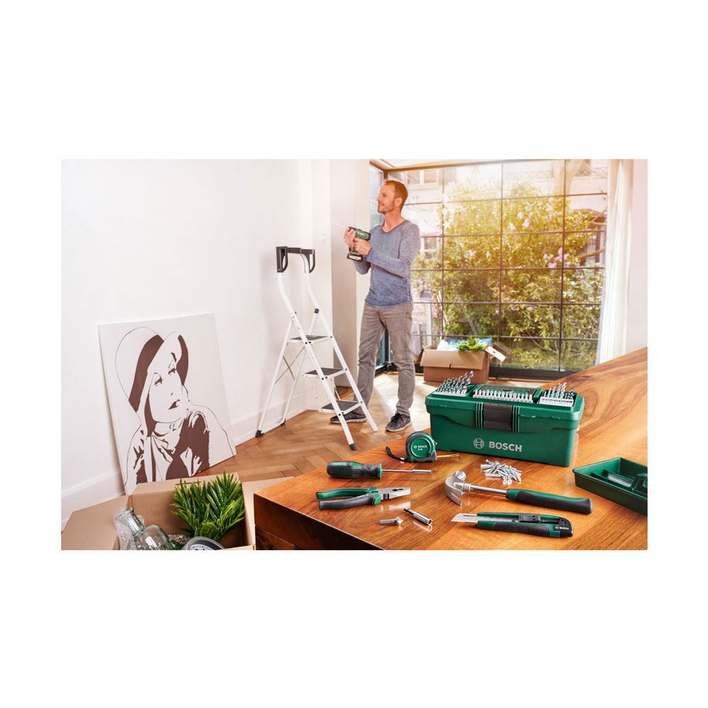 Υλικά παράδοσης: Πένσα, Σφυρί, Κοπίδι, Κατσαβίδι εναλλασσόμενων κεφαλών, Μετροταινία 3 m, 3 τρυπάνια μετάλλου HSS: Ø 3 / 4 / 6 mm, 5 τρυπάνια τοιχοποιίας: Ø 4 / 5 / 6 / 8 / 10 mm, 7 τρυπάνια ξύλου: Ø 3 / 4 / 5 / 6 / 7 / 8 / 10 mm, 16 κατσαβιδόλαμες L = 25 mm: PH 1/2/2/3, PZ 1/2/2/3, S 4/5/6/7, T 15/20/25/30, 6 βίδες 4,0 x 35 mm, 6 βίδες 4,0 x 40 mm, 6 βίδες 5,0 x 50 mm, 6 βύσματα (ούπα): Ø 6 x 30 mm, 6 βύσματα (ούπα): Ø 7 x 32 mm, 6 βύσματα (ούπα): Ø 8 x 35 mm, Μαγνητικός φορέας γενικής χρήσης, Φρεζοτρύπανο, Εργαλειοθήκη