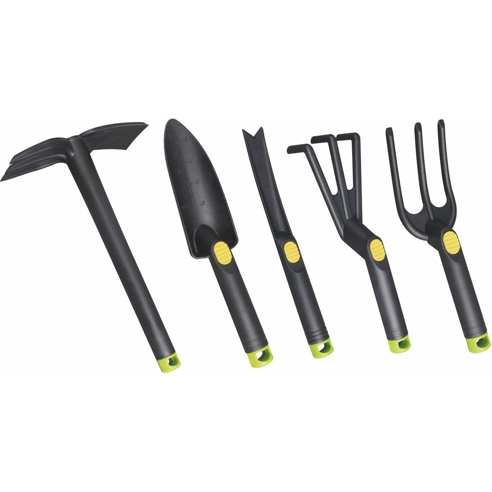 Σετ εργαλείων κήπου. Σέσουλα, τσουγκράνα, σκαφτικό, κόφτης ζιζανίων και τσαπάκι χειρός.