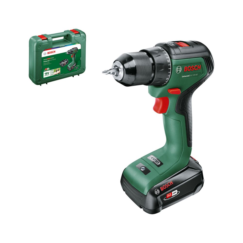 Το UniversalDrill 18V-60 προσφέρει δύναμη, ακρίβεια και ευκολία στο τρύπημα σε ξύλο, μέταλλο και πλαστικό, καθώς και εξασφάλιση βιδώματος χωρίς κόπο. Παράλληλα με την ευελιξία και την ισχύ των 20 ρυθμίσεων ροπής στρέψης και ενός κιβωτίου 2 ταχυτήτων, η τεχνολογία κινητήρα χωρίς ψήκτρες εγγυάται, ότι αυτό το δράπανο λειτουργεί περισσότερο αποτελεσματικά. Το εργαλείο ανήκει στην POWER FOR ALL ALLIANCE. Μια μπαταρία λειτουργεί έναν μεγάλο αριθμό εργαλείων από διαφορετικές μάρκες.