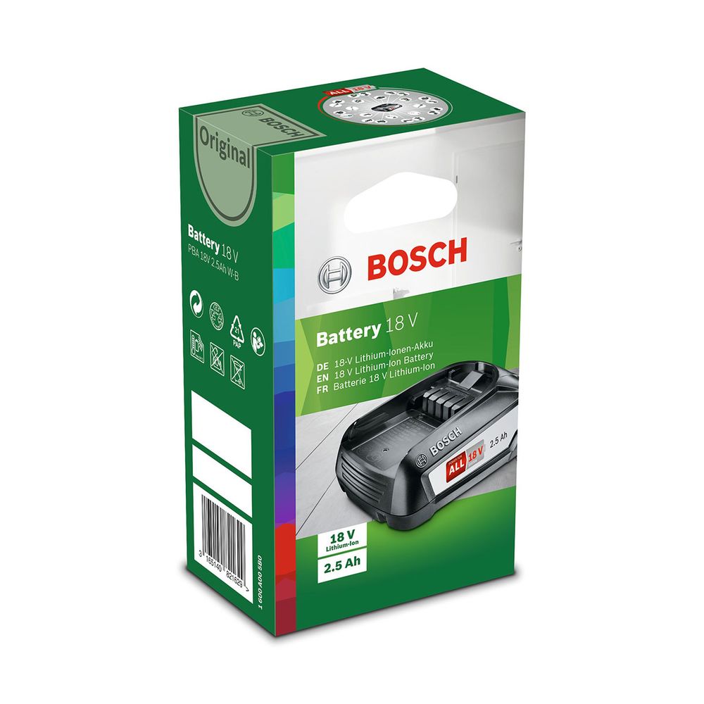 Μια φόρτιση είναι αρκετή ώστε να πραγματοποιήσεις όλες τις δουλειές του σπιτιού και του κήπου σου με απόλυτη ελευθερία κινήσεων, χάρη στην μπαταρία ιόντων λιθίου Bosch PBA 18V - 2,5Ah W-B!