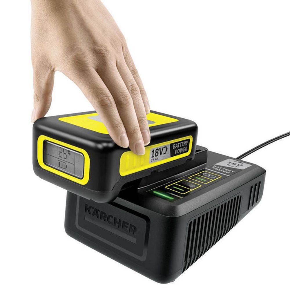 Ο φορτιστής ταχείας φόρτισης φορτίζει την ανταλλάξιμη μπαταρία 18 V/2.5 Ah Battery Power της Kärcher στο 80% μέσα σε μόλις 44 λεπτά και μπορεί να χρησιμοποιηθεί σε όλες τις μπαταρίες της πλατφόρμας μπαταριών 18 V της Kärcher.