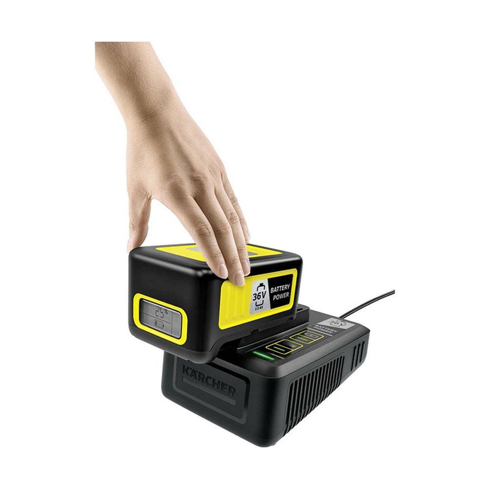 Με τον φορτιστή ταχείας φόρτισης, η ανταλλάξιμη μπαταρία 36 V/2.5 Ah μπορεί να φορτιστεί στο 80% σε μόλις 48 λεπτά. Κατάλληλος και για όλες τις άλλες μπαταρίες της πλατφόρμας μπαταριών 36 V Kärcher.