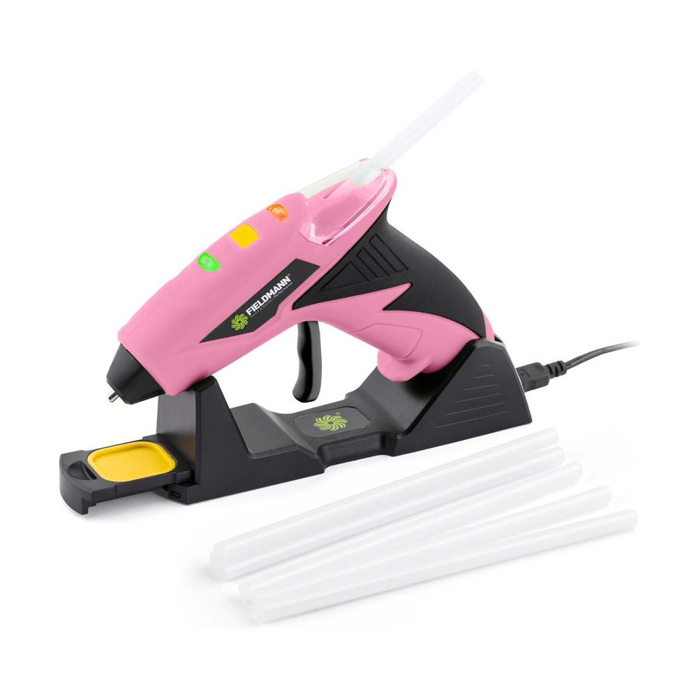 Το ροζ πιστόλι θερμοκολλητικής κόλλας μπαταρίας από τη διάσημη μάρκα Fieldmann έχει σχεδιαστεί για την τήξη και την εφαρμογή θερμοκολλητικής κόλλας στη συγκόλληση πλαστικού, ξύλου, φελλού, υφασμάτων, χαρτονιού και κεραμικών. Η ομαλή και ακριβής δοσολογία της λιωμένης κόλλας είναι δυνατή από έναν ευαίσθητο μηχανικό μοχλό τροφοδοσίας.