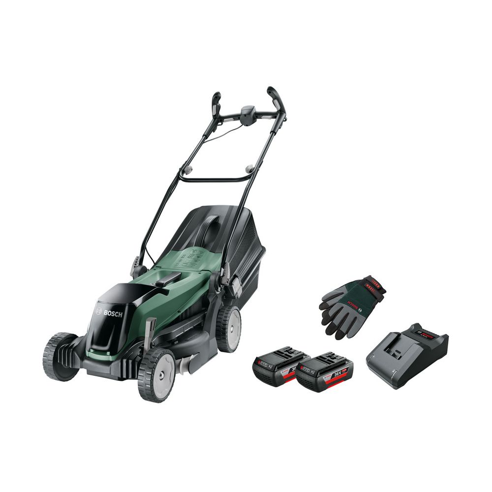 Βάρος: 15,0 kg, Ρύθμιση ύψους κοπής: 5 θέσεις, Είδος λαβής: Σύστημα «Ergoflex», Περιεχόμενα: 2 μπαταρίες 36 V/2.0 Ah ιόντων λιθίου, Φορτιστής AL 36V-20, Κάδος συλλογής χλόης 40 λίτρα, Γάντια κηπουρικής, XL, Χαρτόκουτο