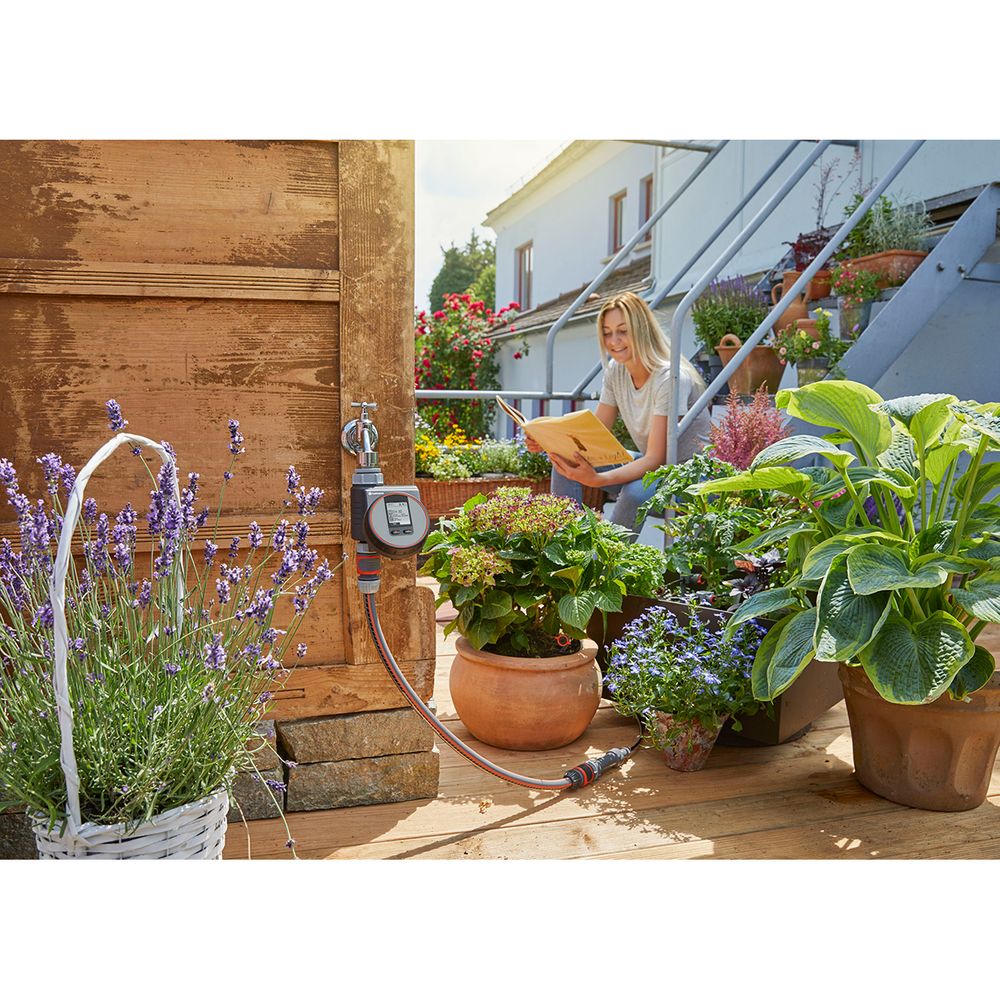 Με τον Προγραμματιστή Μπαταρίας Flex της GARDENA, το πότισμα σε μπαλκόνια, βεράντες οροφής ή αίθρια μπορεί να ελεγχθεί εύκολα με αυτόματο τρόπο. Ο προγραμματιστής λειτουργεί με μπαταρία και μπορεί να συνδεθεί απευθείας στη βρύση. Λειτουργεί μέσω ενός καινοτόμου εξωτερικού περιστροφικού στοιχείου για την επιλογή δεδομένων και ενός κουμπιού επιβεβαίωσης. Μια ευανάγνωστη οθόνη LCD δείχνει όλες τις ρυθμίσεις με μια ματιά. Η μονάδα προστασίας από τις καιρικές συνθήκες μπορεί να αφαιρεθεί.