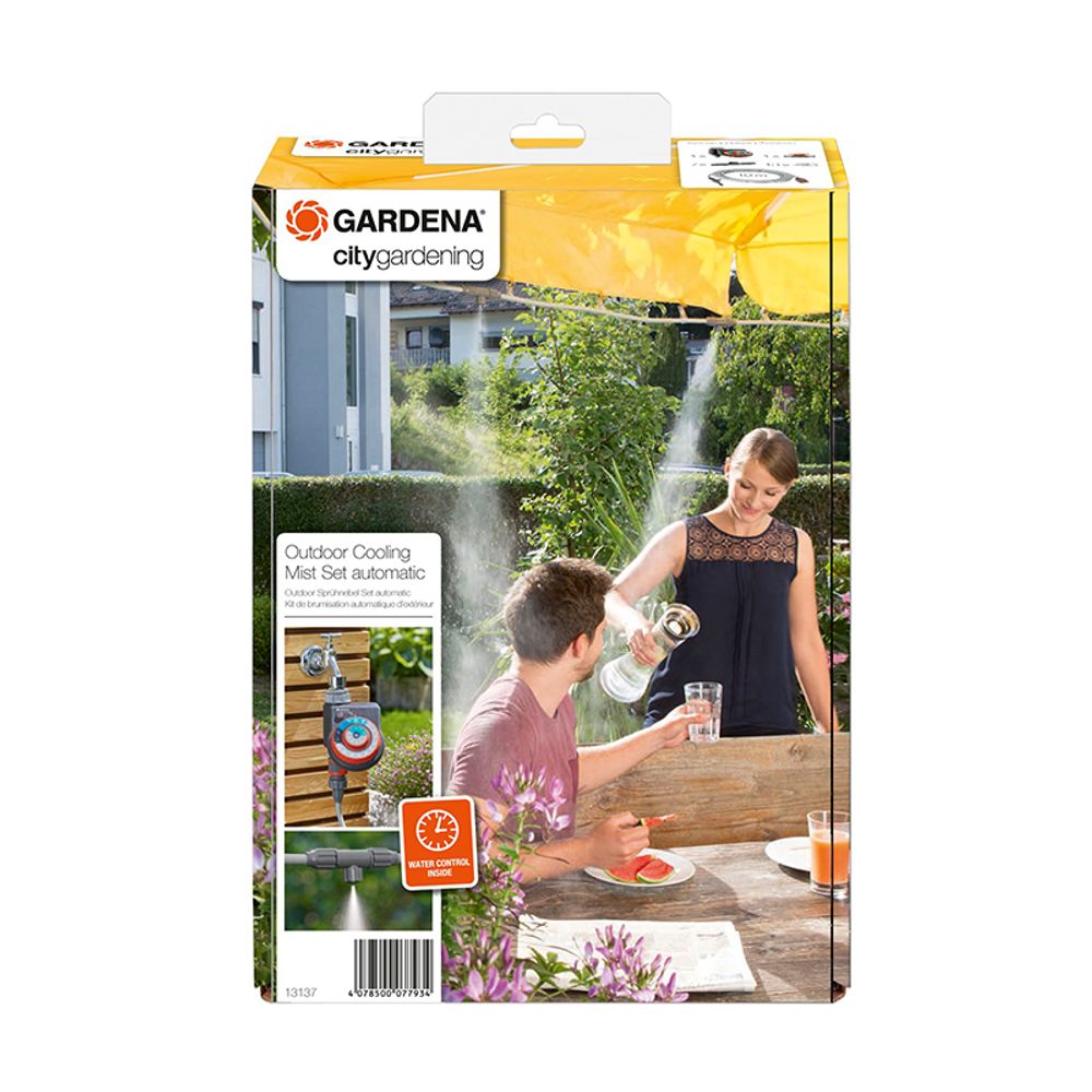 Το Σετ Υδρονέφωσης City Gardening με Προγραμματιστή της Gardena σε βοηθά να δροσίζεσαι στους εξωτερικούς χώρους τις ζεστές καλοκαιρινές μέρες. Το σύστημα διαθέτει μπεκ νέφωσης που προσαρμόζονται εύκολα σε μια ομπρέλα, τέντα ή πέργκολα και συνδέονται με τη βρύση. Τα μπεκ δημιουργούν μια λεπτή ομίχλη που δροσίζει ευχάριστα την ατμόσφαιρα. Χάρη στον προγραμματιστή EasyPlus, η διάρκεια και η συχνότητα της δροσιστικής ομίχλης μπορούν να ρυθμιστούν ανάλογα με τις ανάγκες σου.