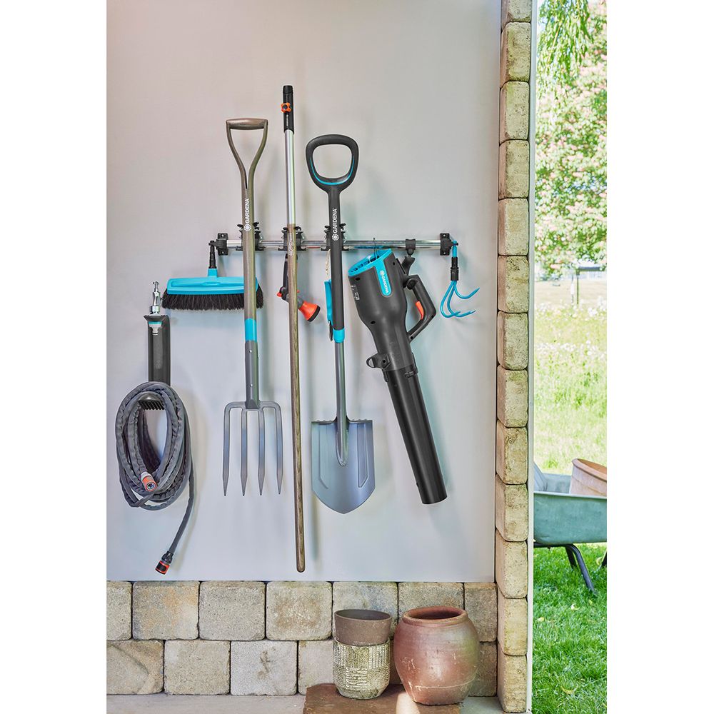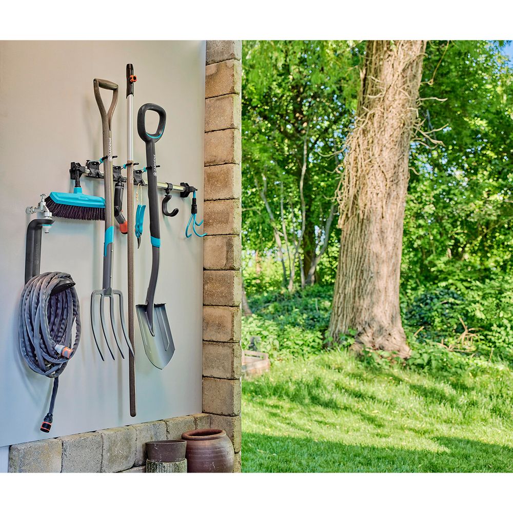 Μεταλλική βάση στήριξης εργαλείων Plus της Gardena, ιδανική για τη φύλαξη βαριών εργαλείων κήπου, όπως φτυάρια και πιρούνες, καθώς και προϊόντων Gardena combisystem και μονοκόμματων μεγάλων εργαλείων. Κατασκευάζεται από αλουμίνιο και μπορεί να φέρει βάρος 60 kg. Στα τρία στηρίγματα μπορείς να τοποθετήσεις εργαλεία βάρους έως 10 kg το καθένα. Ο γάντζος γενικής χρήσης είναι κατάλληλος για τη φύλαξη εργαλείων και υποστηρίζει μέγιστο βάρος 5 kg.