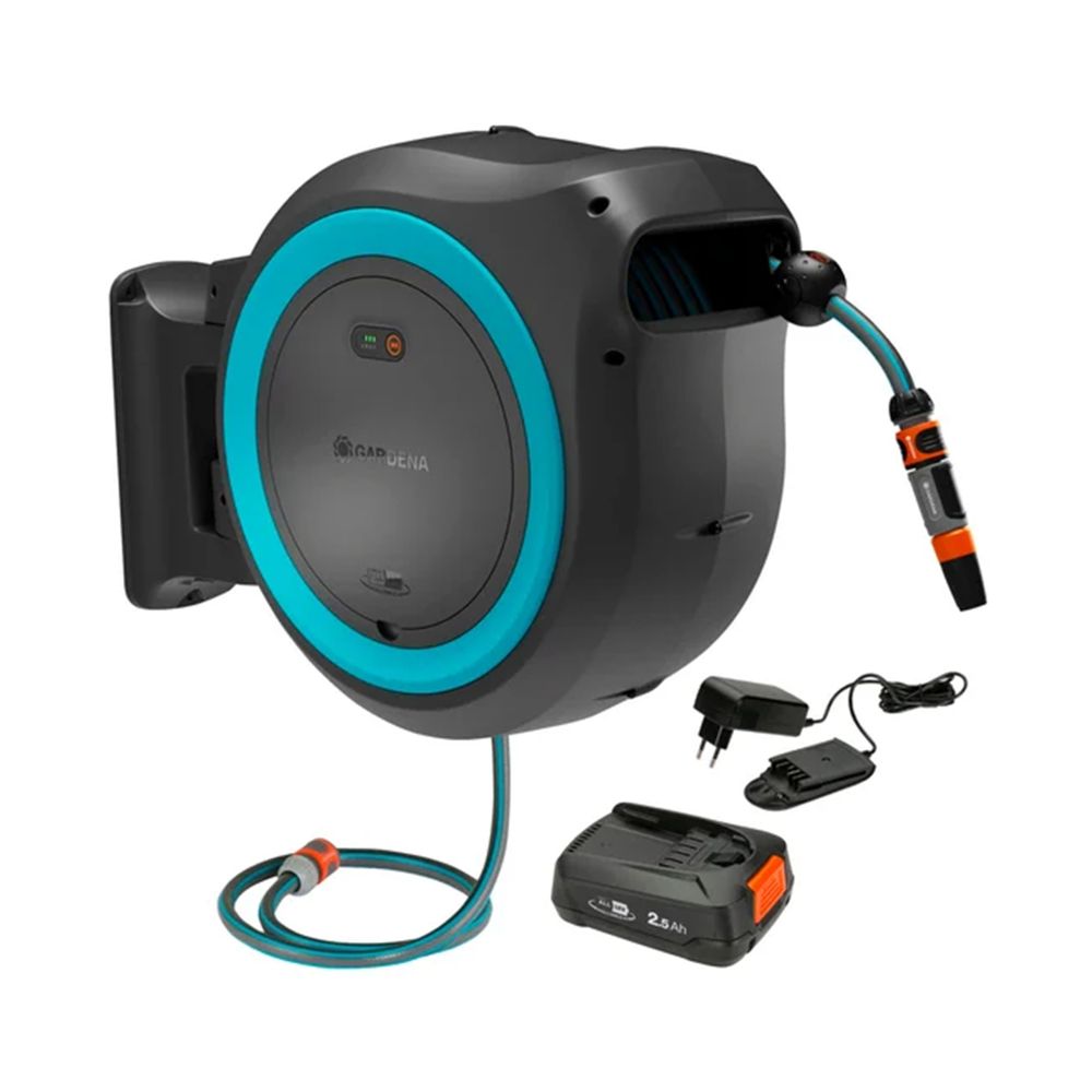 Περιλαμβάνει: 1 Καρούλι Λάστιχου Gardena Αυτόματο PowerRoll Σετ XXL που περιλαμβάνει 1 λάστιχο GARDENA 40 m 13 mm (1/2"), 1 συνδετικό σωλήνα, 1 x αυθεντικά εξαρτήματα του συστήματος σύνδεσης GARDENA (ρακόρ βρύσης και ταχυσύνδεσμοι λάστιχου, σύνδεσμος στοπ), 1 ακροφύσιο καθαρισμού, 1 επιτοίχια βάση με βίδες, βύσματα τοίχου και βοήθημα τοποθέτησης, 1 μπαταρία συστήματος P4A PBA 18V/45 συμπ. φορτιστή P4A AL 1810 CV.