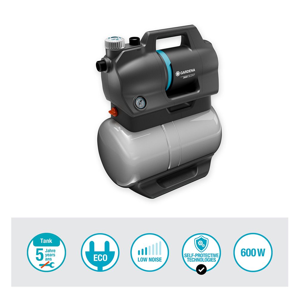 Το GARDENA Pressure Tank Unit 3800 Silent προσφέρει αποτελεσματική χρήση νερού για το σπίτι και τον κήπο, χρησιμοποιώντας νερό από δεξαμενές, πηγάδια ή στέρνες. Λειτουργεί αυτόματα με βάση τη ζήτηση, προσφέροντας αθόρυβη και οικονομική λειτουργία. Με ισχύ 600W, παρέχει 3800 λίτρα/ώρα και μέγιστη πίεση 3,9 bar. Διαθέτει 21 λίτρα δεξαμενή με μεμβράνη που δεν απαιτεί συντήρηση για 5 χρόνια. Το πλαστικό περίβλημα μειώνει τον θόρυβο, ενώ τα λαστιχένια πόδια εξασφαλίζουν σταθερότητα.