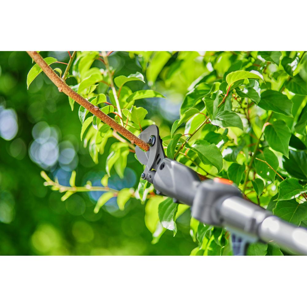 Το έτοιμο για χρήση σετ Τηλεσκοπικού Κλαδευτηριού Μπαταρίας HighCut 250/18V P4A από την Gardena σε βοηθά να κλαδεύεις εύκολα σε μεγάλα ύψη από το έδαφος. Το Τηλεσκοπικό Κλαδευτήρι φτάνει σε μήκος έως 2.5 μέτρα, οπότε επιτυγχάνεται συνολικό ύψος έως 4 μέτρων κατά το κλάδεμα. Χάρη στον αποσπώμενο άξονα, το HighCut μεταφέρεται και φυλάσσεται εύκολα. Η ενδεικτική λυχνία LED στην εργονομική λαβή υποδεικνύει την κατάσταση φόρτισης της μπαταρίας.