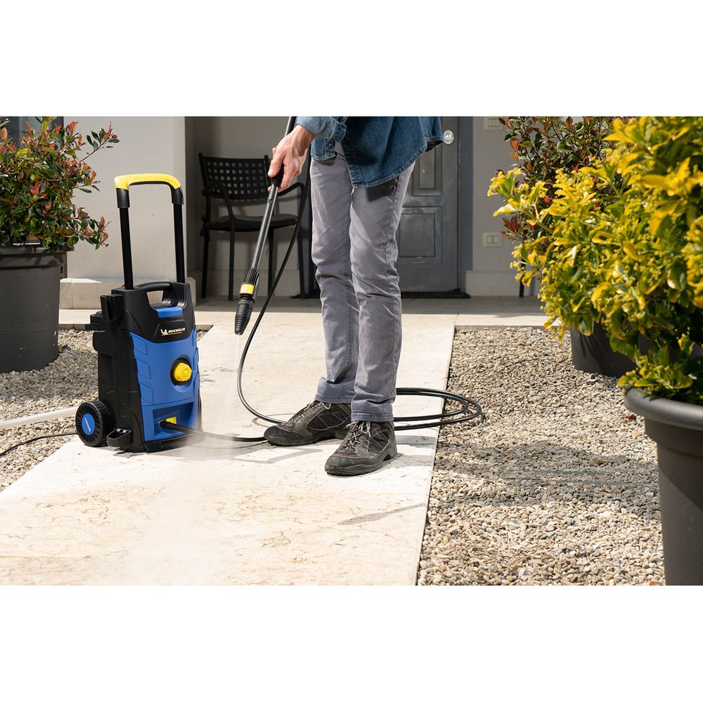 Πλυστικό Michelin με κινητήρα χωρίς ψήκτρες για μεγαλύτερη διάρκεια ζωής, μεταλλική αντλία με ατσάλινα έμβολα για μεγαλύτερη διάρκεια ζωής, θερμική προστασία κινητήρα, total stop system που απενεργοποιεί τον κινητήρα όταν δεν πατάμε την σκανδάλη και εργονομική και τηλεσκοπική χειρολαβή. Διαθέτει ευκολά ελεγχόμενο φίλτρο νερού, ανέμη για το λάστιχο και θέσεις πάνω στο πλυστικό για αποθήκευση των εξαρτημάτων.
