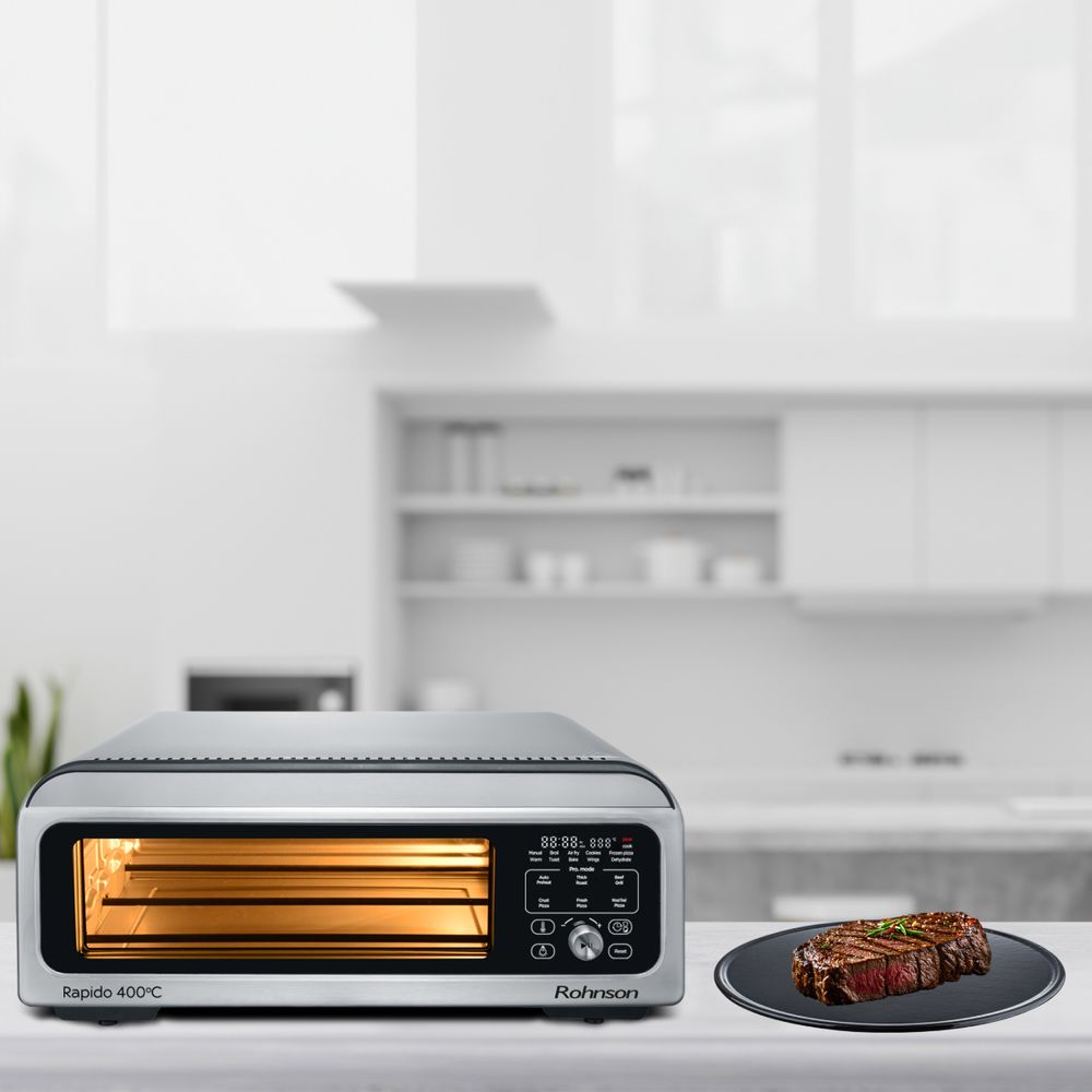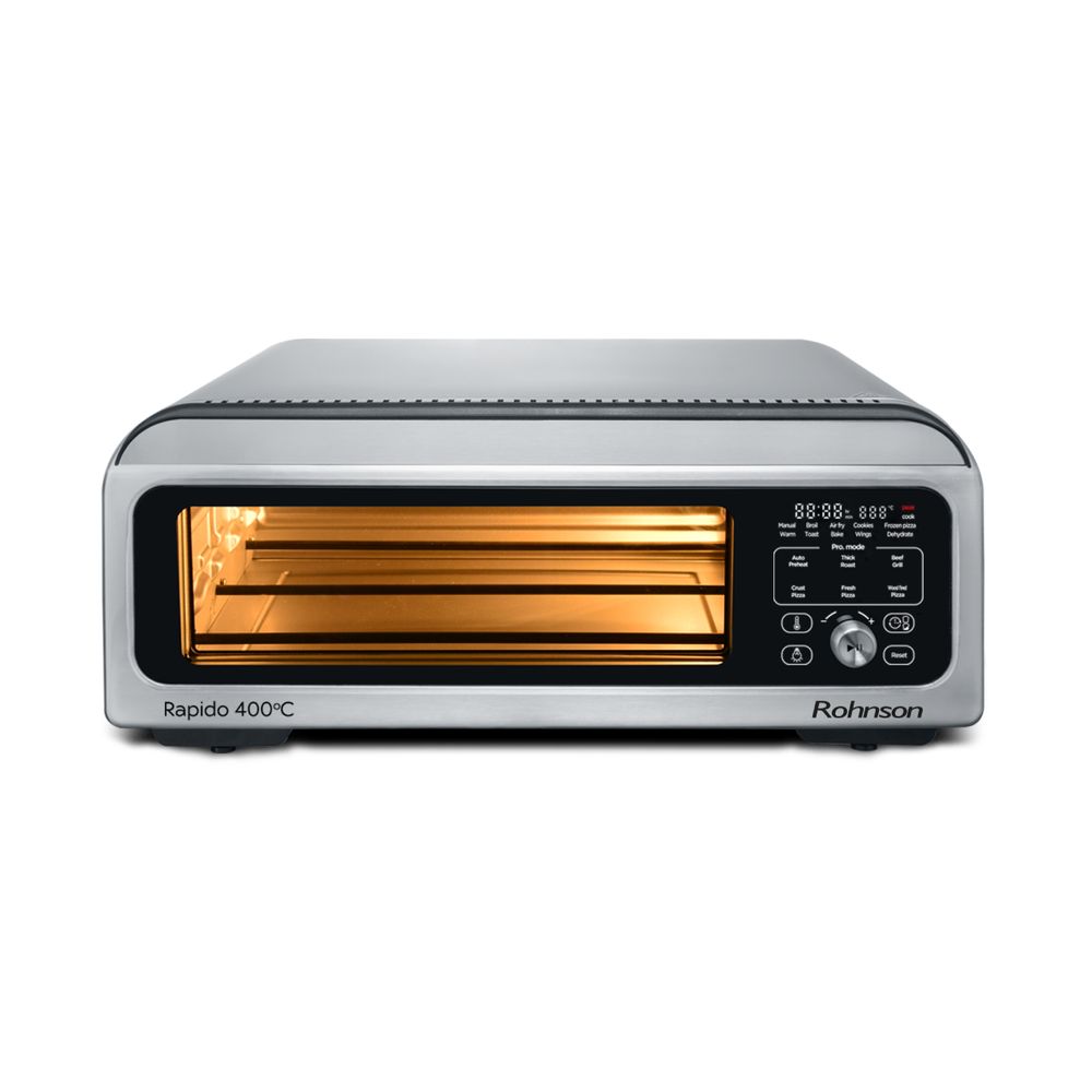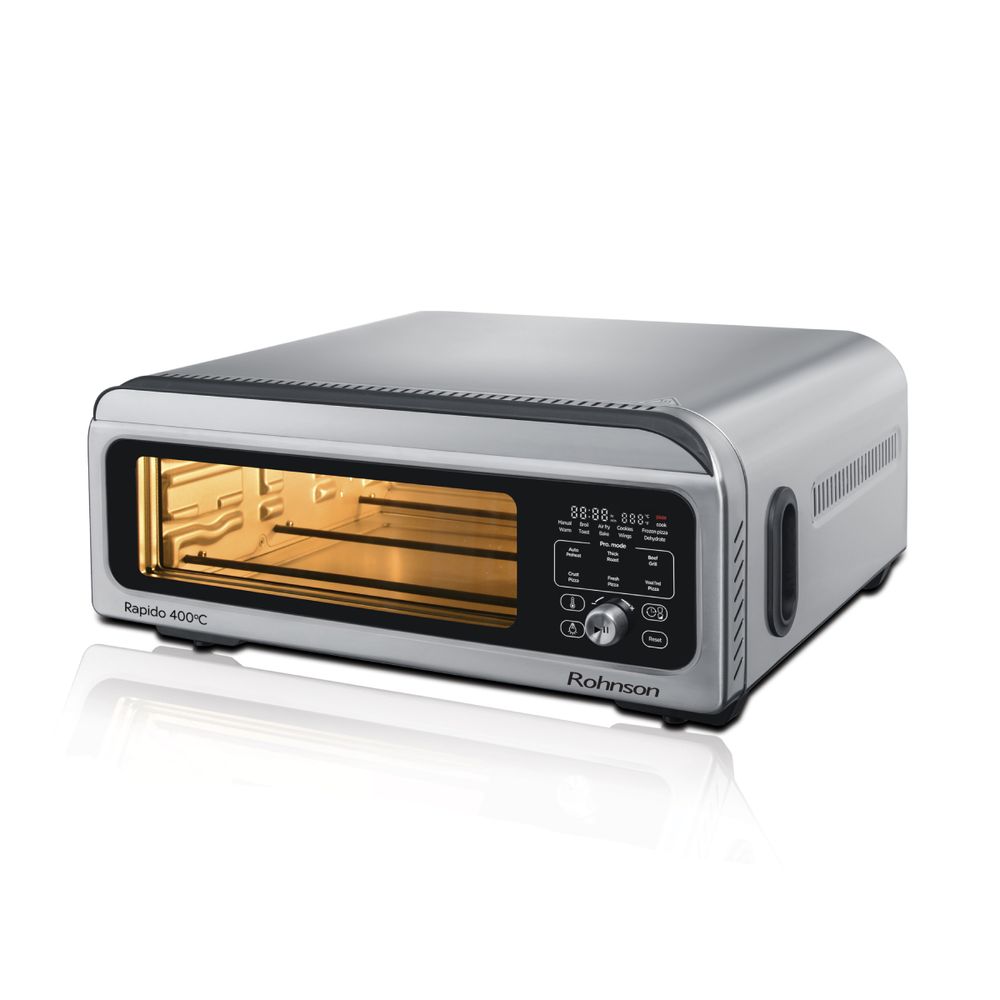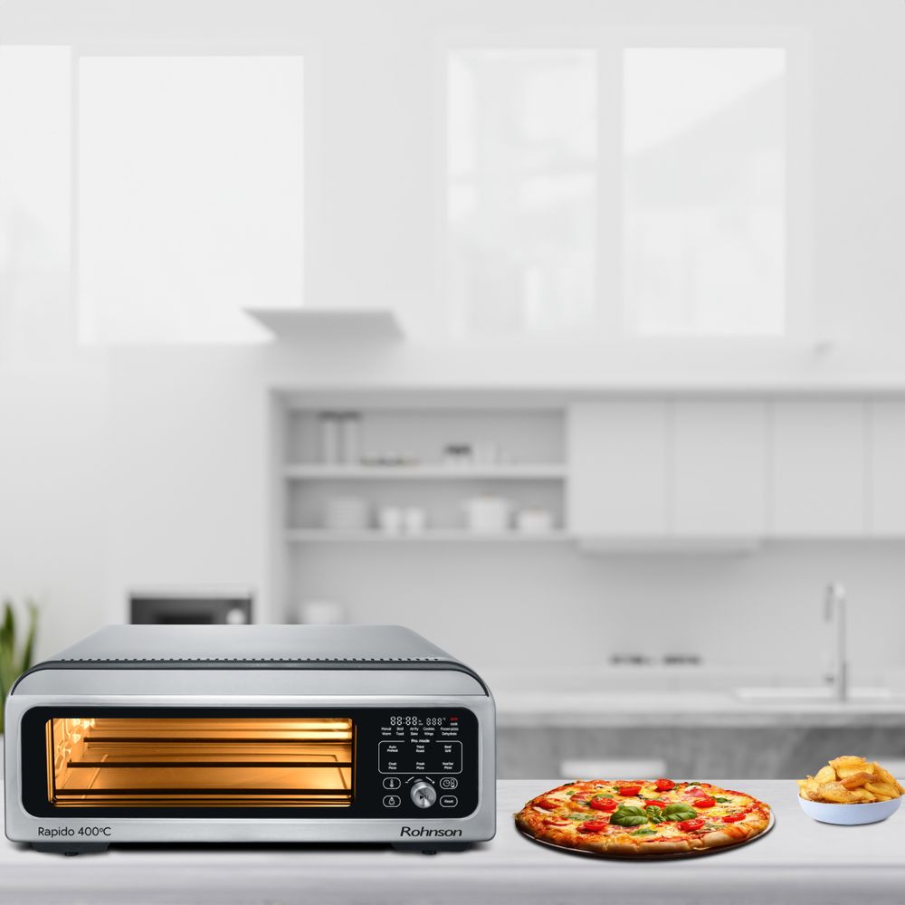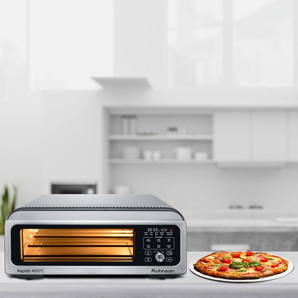 Το φουρνάκι Πίτσας και Φριτέζας Αέρος Rohnson R-2880 Rapido 400°C είναι η απόλυτη πολυχρηστική συσκευή 18 λίτρων με ισχύ 2000W και θερμοκρασία έως 400°C. Ψήνει τέλειες πίτσες 30cm σε τέσσερα στυλ και έξι επίπεδα κρούστας. Λειτουργεί και ως air fryer για ψήσιμο, τηγάνισμα χωρίς λάδι, ψήσιμο σε σχάρα και ζέσταμα. Ιδανικό για εύκολα και υγιεινά καθημερινά γεύματα.
