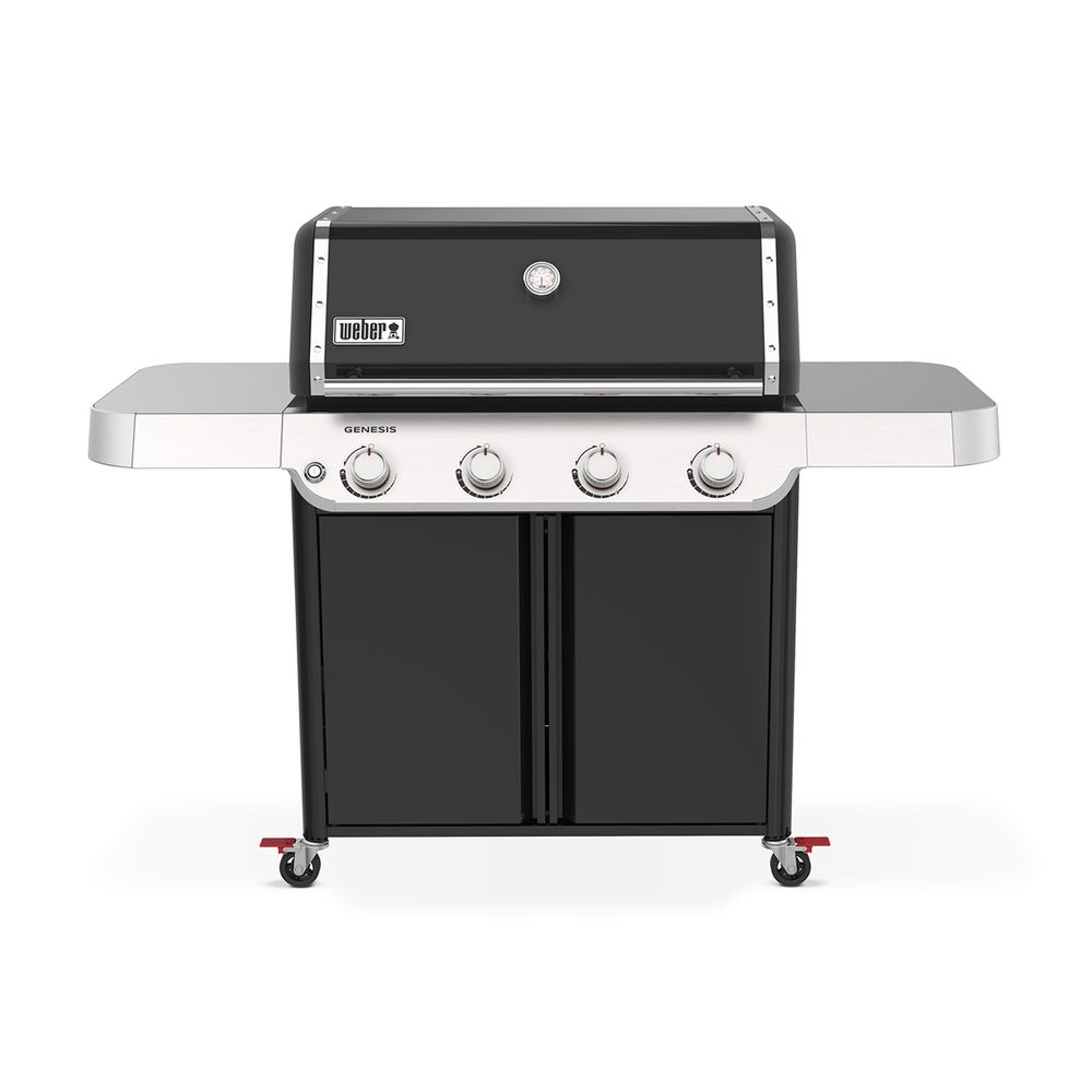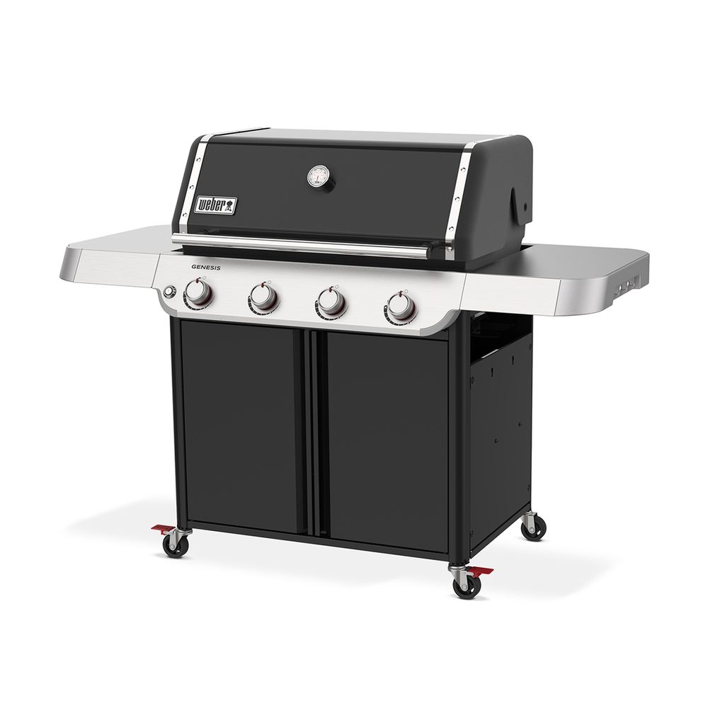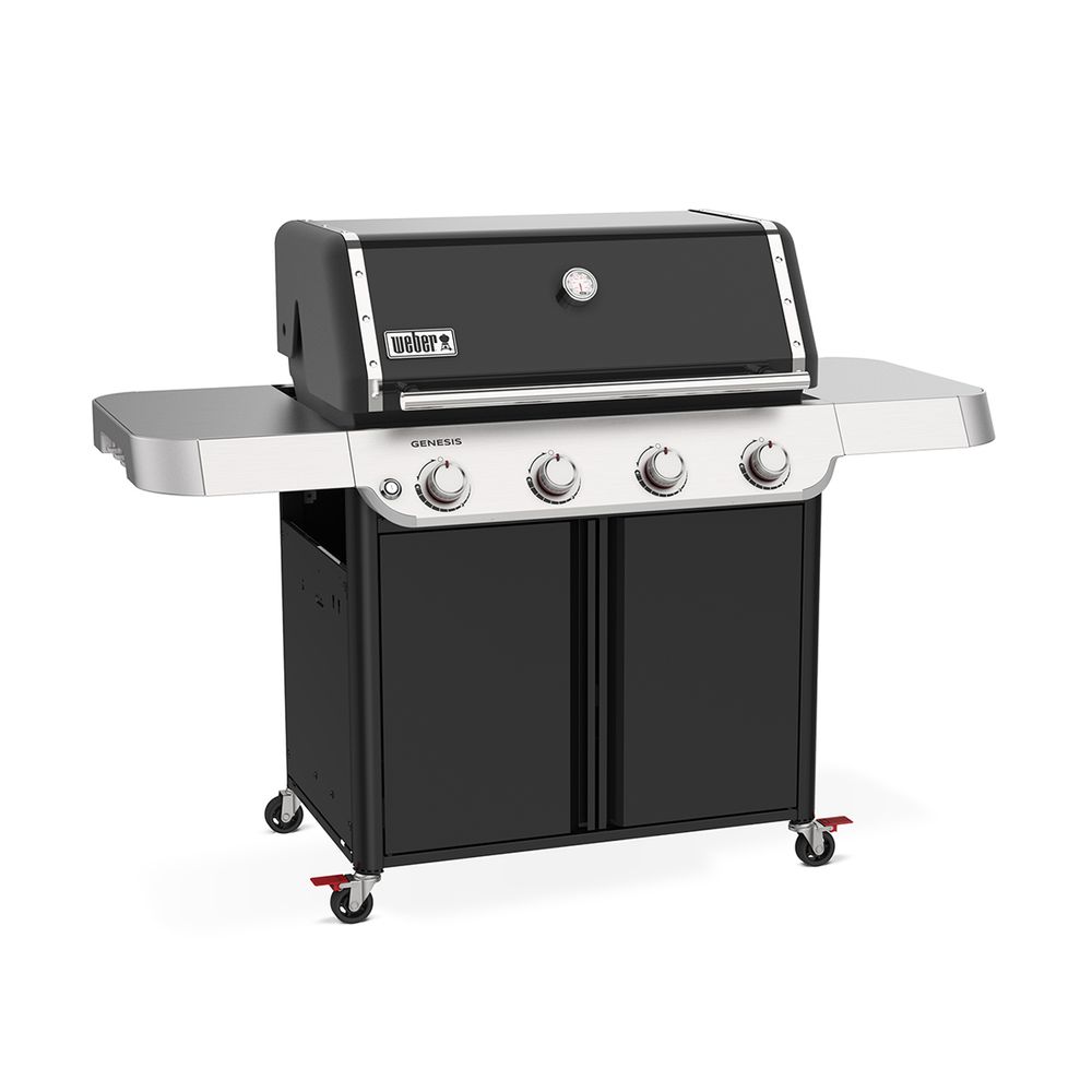 Ψησταριά υγραερίου Weber Genesis E-415 με 4 καυστήρες PureBlu συνολικής ισχύος 15.2kW, ηλεκτρονική ανάφλεξη, μπάρες αρωματισμού, ενσωματωμένο θερμόμετρο καπακιού, αποσπώμενο δίσκο συλλογής λίπους, σχάρες μαγειρέματος από μαντέμι και μεγάλο πτυσσόμενο τραπέζι προετοιμασίας και σερβιρίσματος.