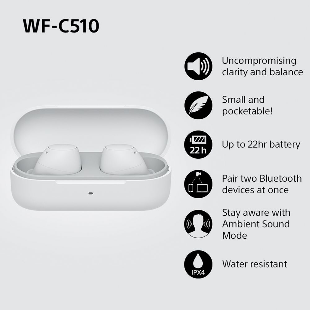 Τα Sony WF-C510 προσφέρουν κορυφαία ποιότητα ήχου, την καλύτερη ποιότητα κλήσεων χάρη στην τεχνολογία DSEE, έναν εξαιρετικά άνετο σχεδιασμό και λειτουργία multipoint για εύκολη χρήση με τις αγαπημένες σου συσκευές.