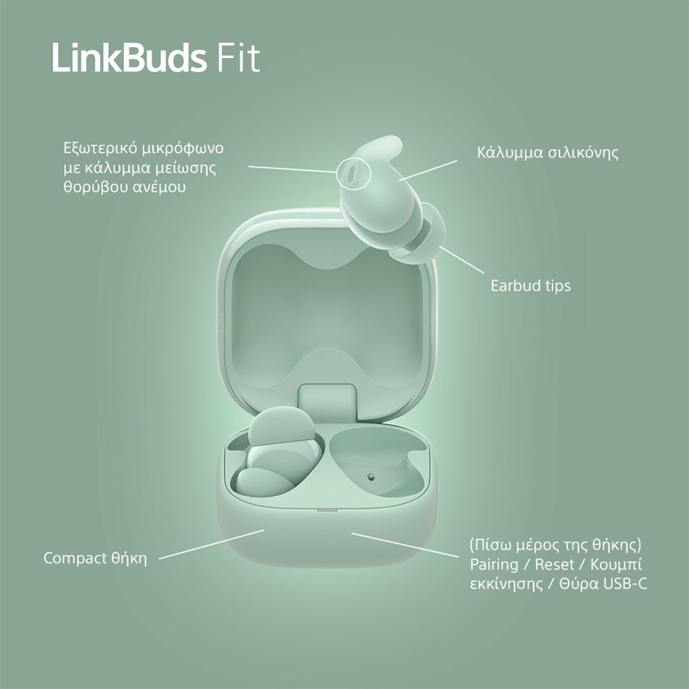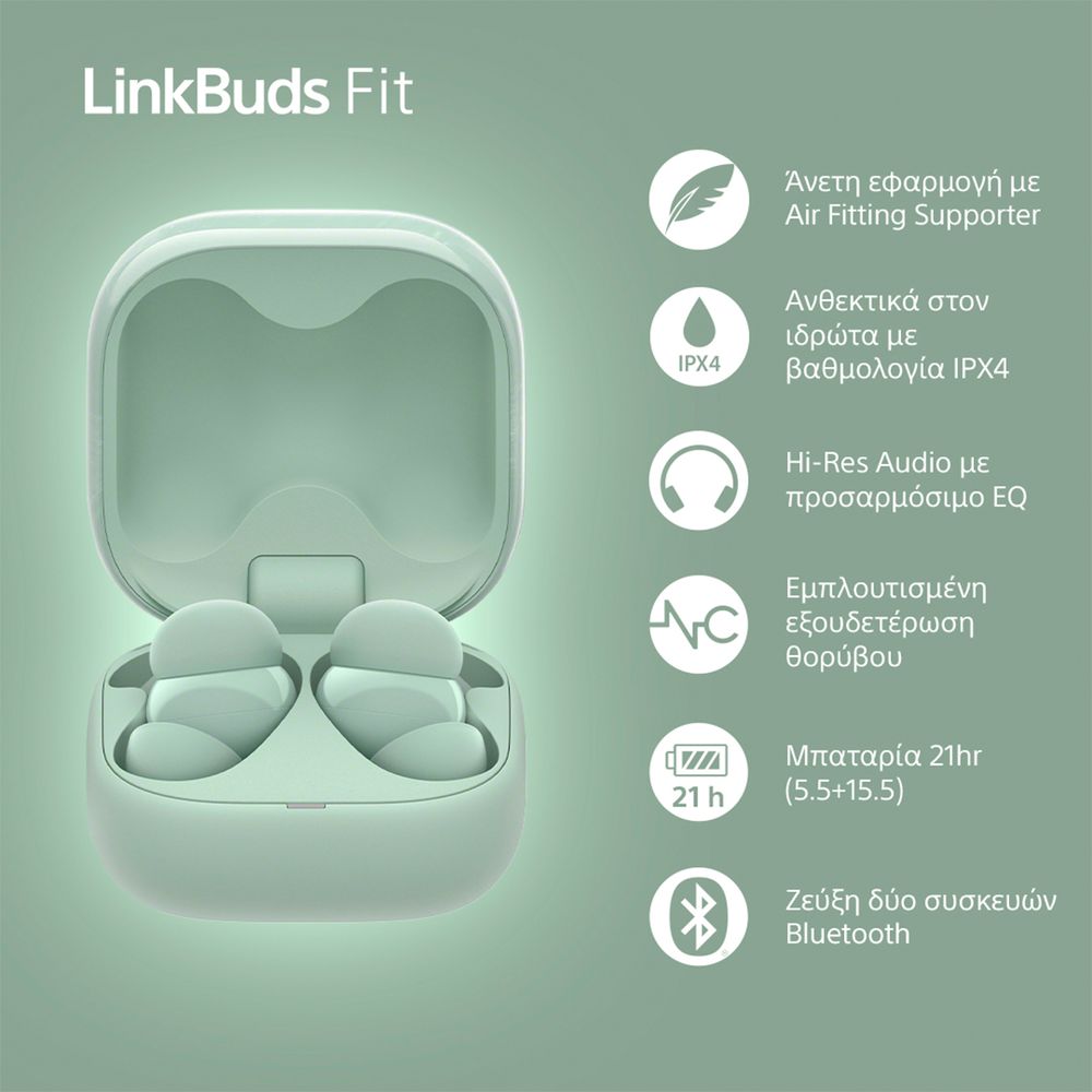 Η Sony παρουσιάζει τα LinkBuds Fit: Ζυγίζοντας 4,8 g, προσφέρουν άνεση με καινοτόμο μαξιλάρι air cushion και σταθερή εφαρμογή. Ανθεκτικά στο νερό (IPX4), με εξαιρετικό ήχο, λεπτομερείς ψηλές, ισχυρές χαμηλές και πλούσια μεσαία. Έχουν Hi-Res Audio Wireless πιστοποίηση, DSEE Extreme για αναβάθμιση κάθε κομματιού, και προσαρμόσιμο EQ. Προσφέρουν 21 ώρες αναπαραγωγής, γρήγορη φόρτιση, multipoint σύνδεση Bluetooth και ανακυκλωμένα υλικά στη συσκευασία και τα ακουστικά, χωρίς πλαστικό.