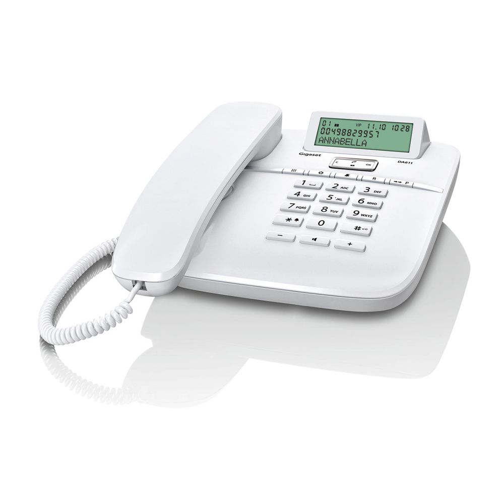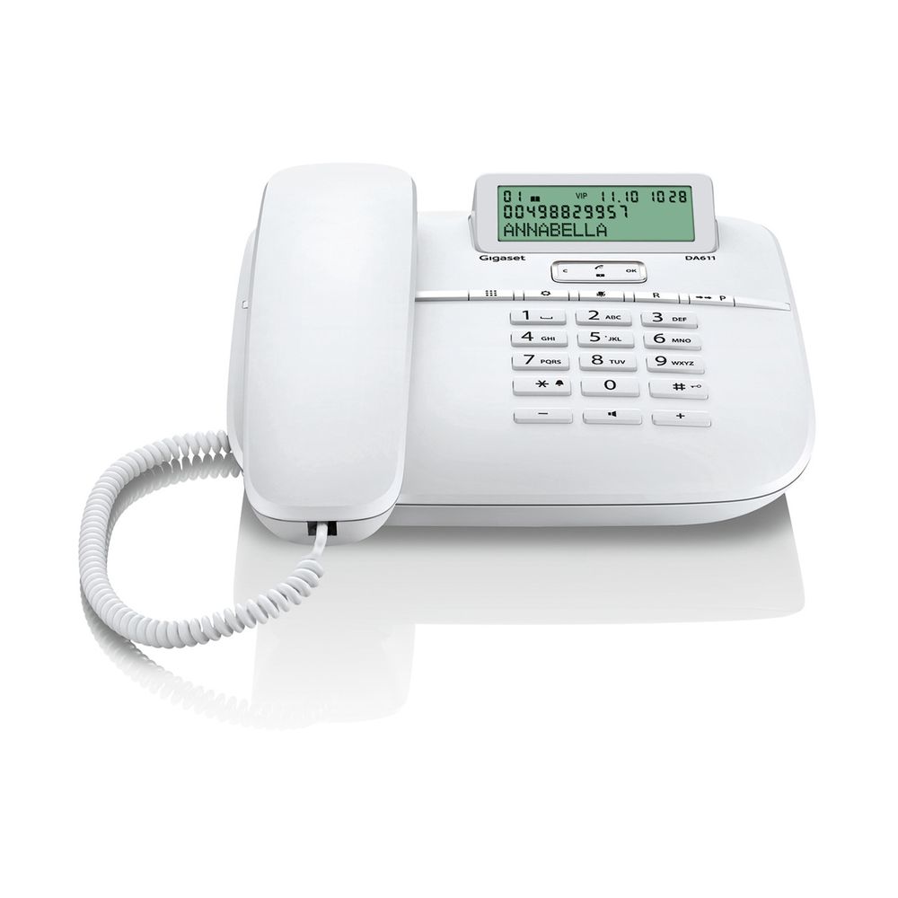Σταθερό ενσύρματο τηλέφωνο DA611 White από την εταιρεία Gigaset με αναγνώριση κλήσεων, εμφάνιση ονόματος αποθηκευμένων αριθμών, φωτιζόμενο πλήκτρο ανοικτής συνομιλίας και σίγαση μικροφώνου με μουσική στην αναμονή.